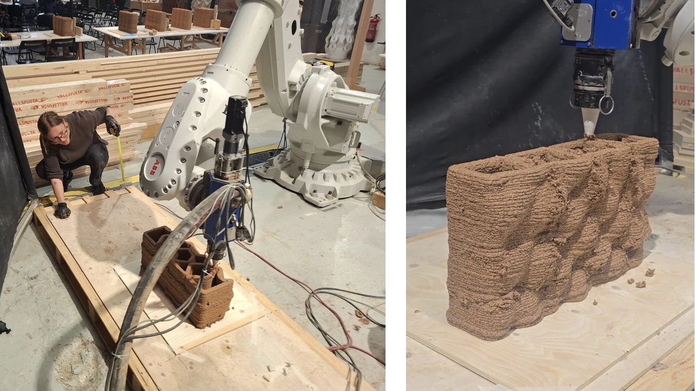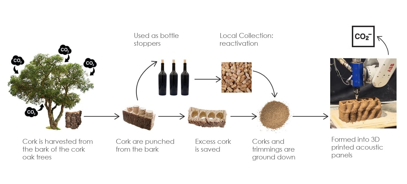 By collecting local cork waste from bars, restaurants, households, and recycling streams, the project transforms a low-value residue into a printable architectural material. This shift from waste to resource is central to the project’s ecological and design logic.