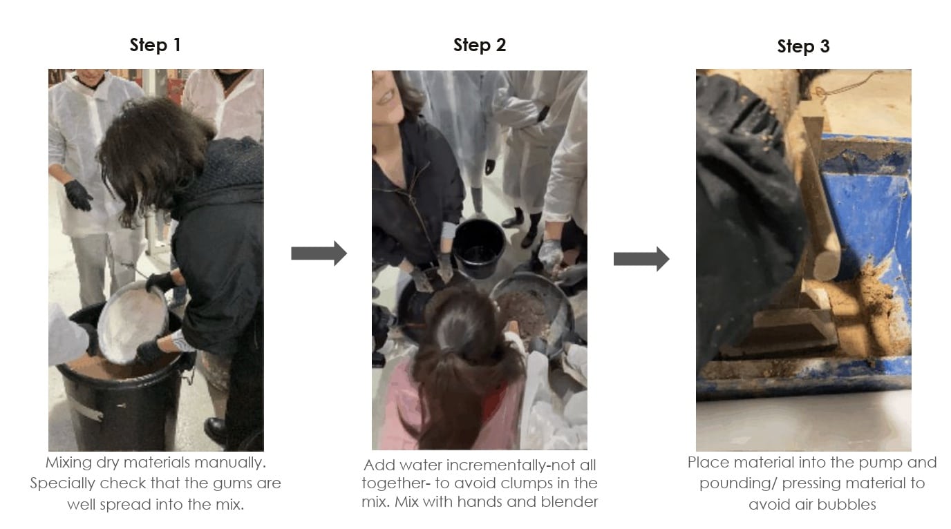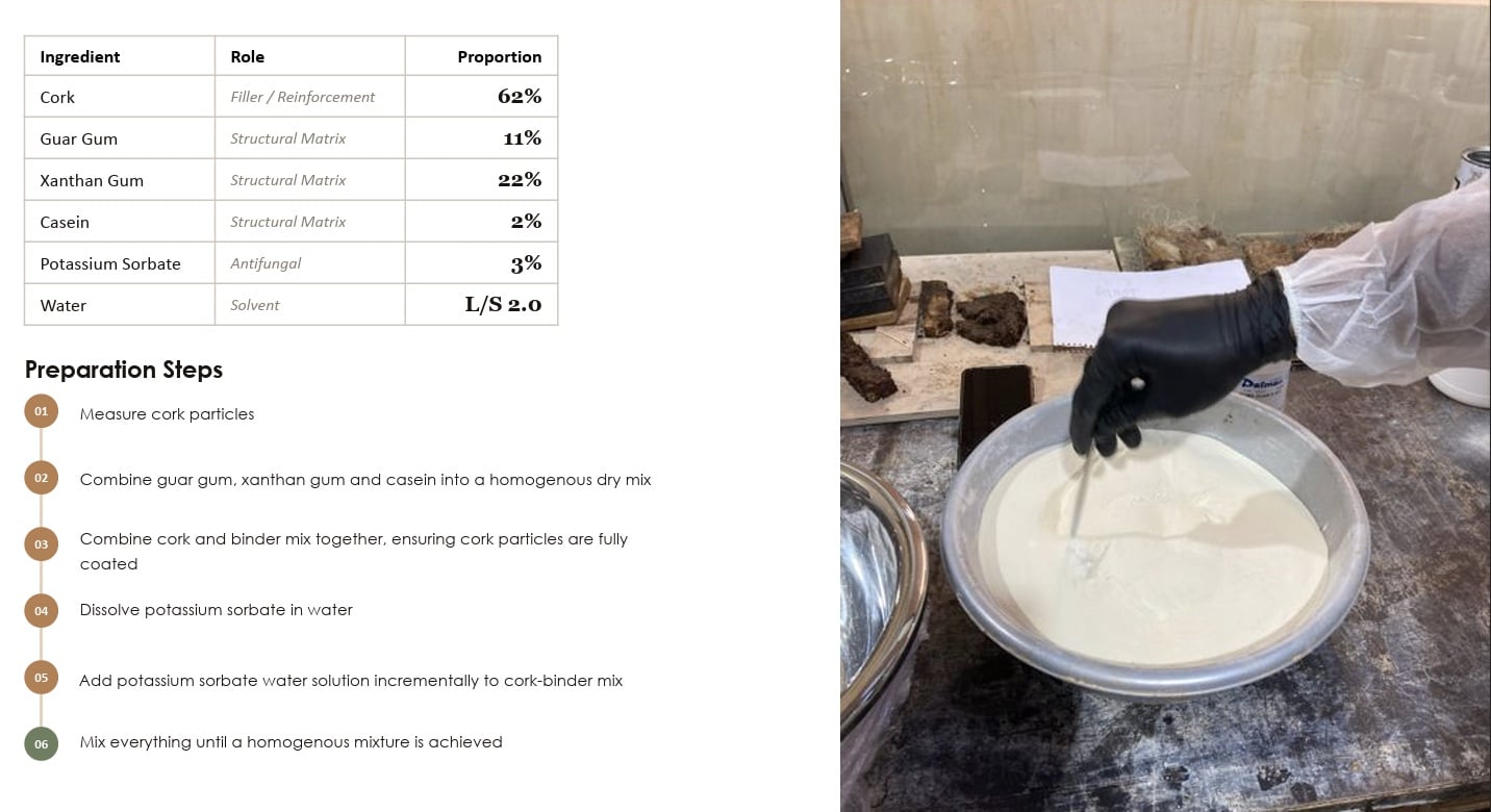 To create a printable paste, we developed a cork-based composite using guar gum, xanthan gum, casein, potassium sorbate, and water. Cork acts as the main filler and reinforcement, while the binder system gives the material enough cohesion for extrusion and structural stability. The final formula used 62% cork, 11% guar gum, 22% xanthan gum, 2% casein, 3% potassium sorbate, and water at a liquid-to-solid ratio of 2.0. The mixing process required careful handling: dry ingredients had to be blended evenly before water was added gradually to avoid clumps and ensure a homogeneous paste.