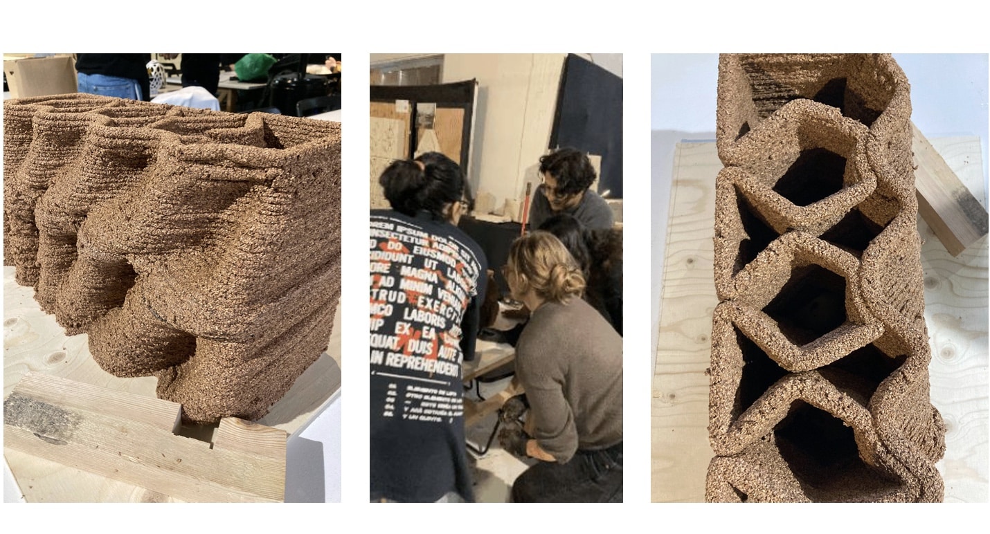 The panels were produced through large-scale additive manufacturing, using the cork composite as a printable paste. This process allowed us to move from material testing to architectural prototyping, demonstrating how biomaterials can be translated into performative built elements.