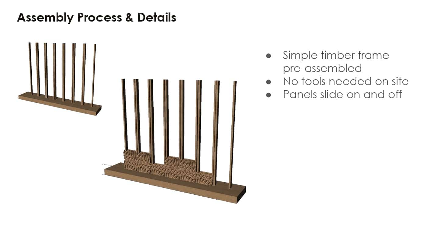 A key part of the system is its reusability and on-site simplicity. The structure uses a pre-assembled timber frame, requires no tools during installation, and allows panels to slide on and off easily.