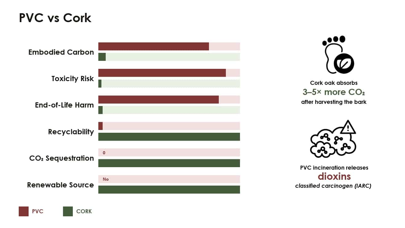 One of the strongest arguments for the project is its environmental logic. Compared with PVC, cork offers a lower-toxicity, renewable alternative with the potential for carbon sequestration, while PVC is associated with end-of-life pollution and incineration risks.