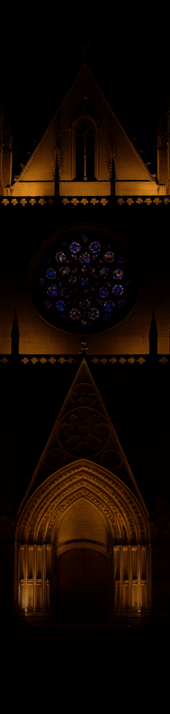 Darkness falls. The cathedral glows faintly. Étienne rises, disturbed by bursts of light and sound. Ashley steps out of a taxi, adjusting her phone camera, speaking to her followers.)