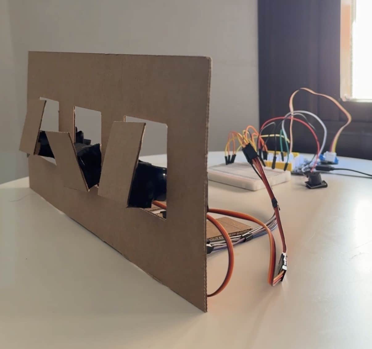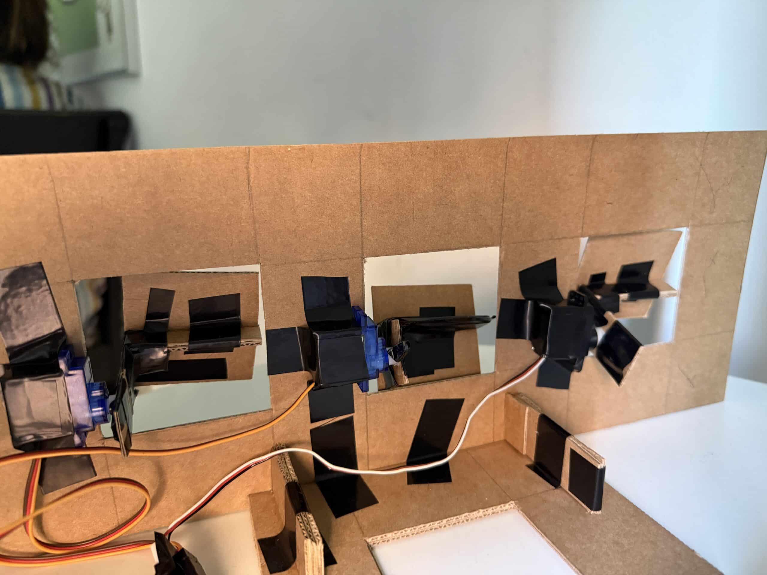 When the light level rises above the threshold, the servos move in a smooth oscillation, mimicking kinetic movement on a building’s façade.