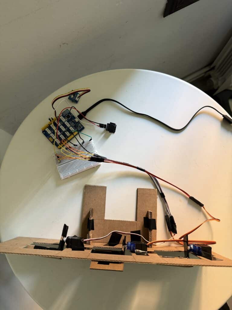 How to create a simple kinetic façade prototype using Arduino, servo motors, and a light-dependent resistor (LDR) was explored in the project . The façade reacts to ambient light levels: when it’s bright, the panels move dynamically, and when it’s dark, the system stops and triggers a buzzer as a signal.