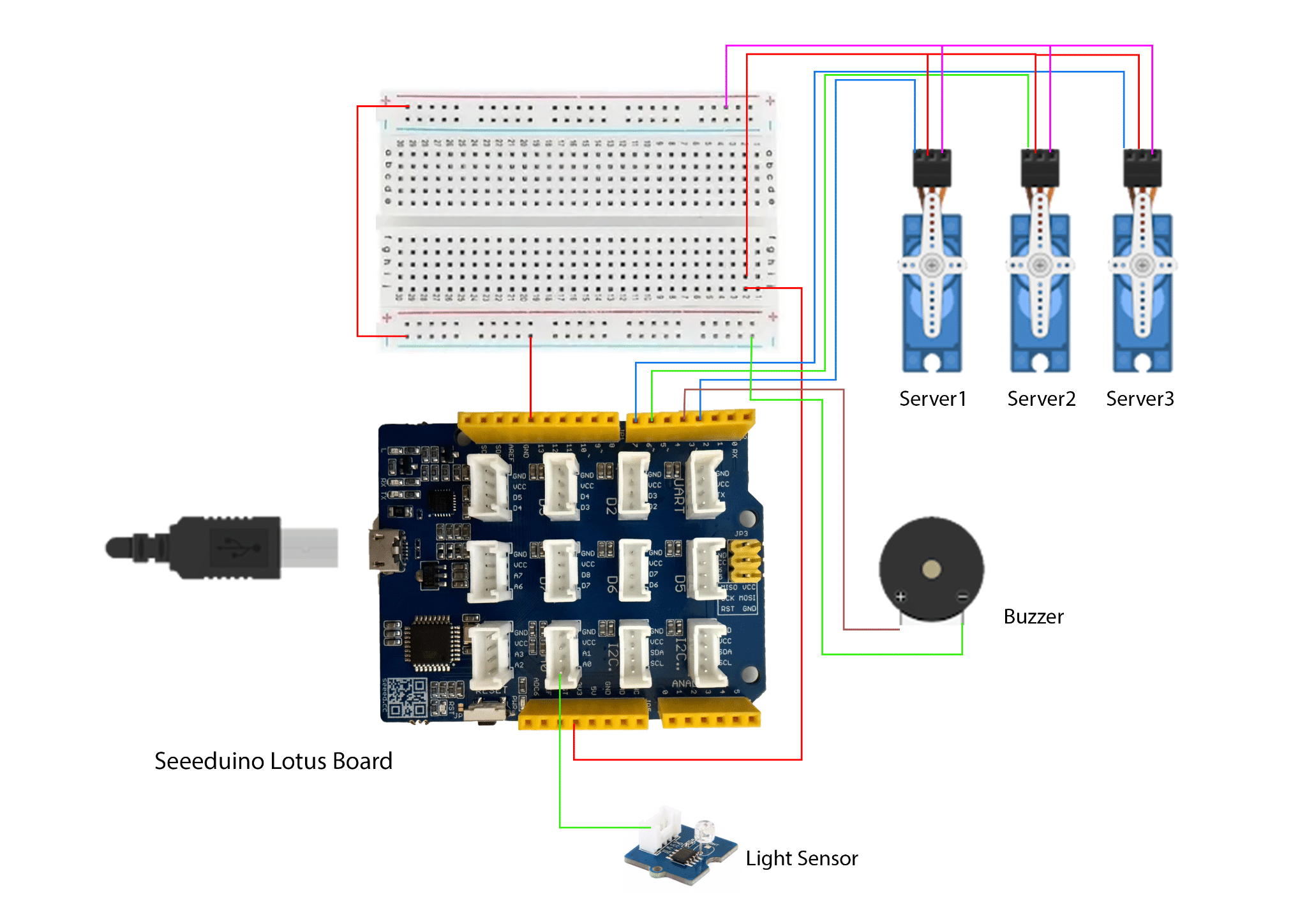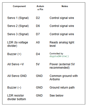 When the light level is below a certain threshold (e.g., 400), the servos stop, and the buzzer activates.
