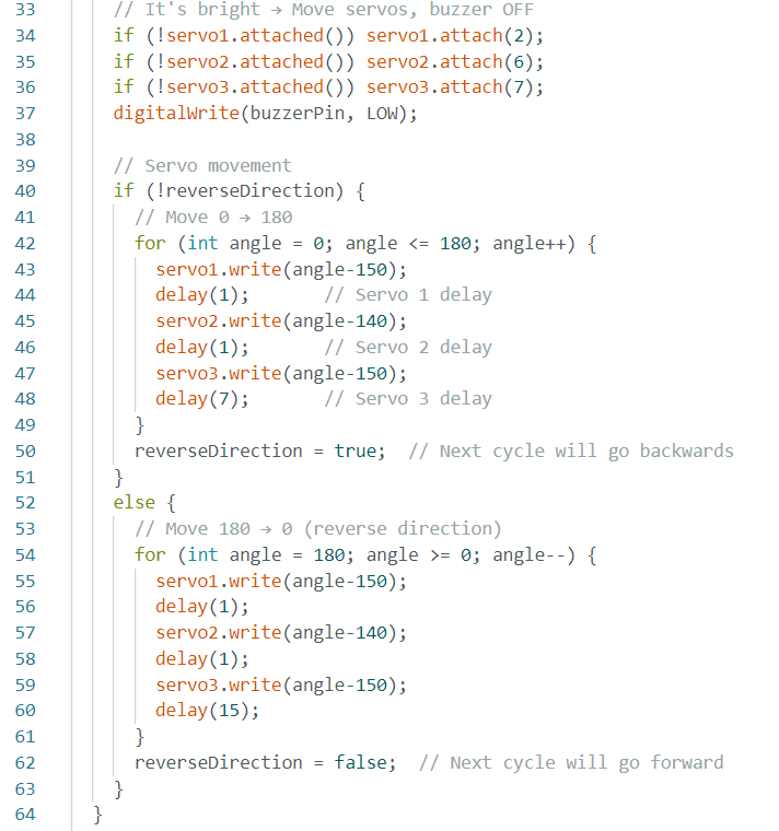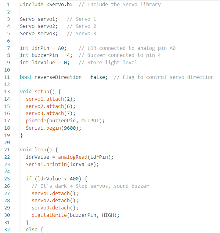 Below is the Arduino code that forms the core logic of our kinetic façade system. It controls three servo motors that represent façade panels and uses an LDR to detect light intensity.
