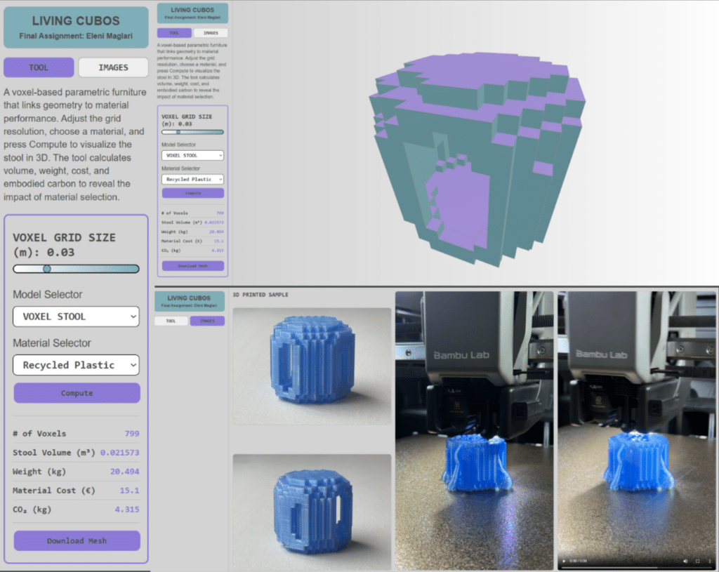 Living Cubos is a web-based voxelized geometry analysis tool developed in Grasshopper using the VoxelTool plugin. The goal of this project is to explore how voxel geometry can connect design decisions with material performance and environmental impact.