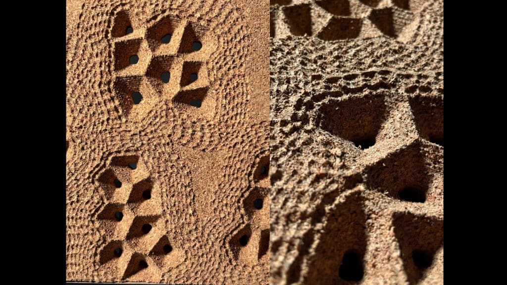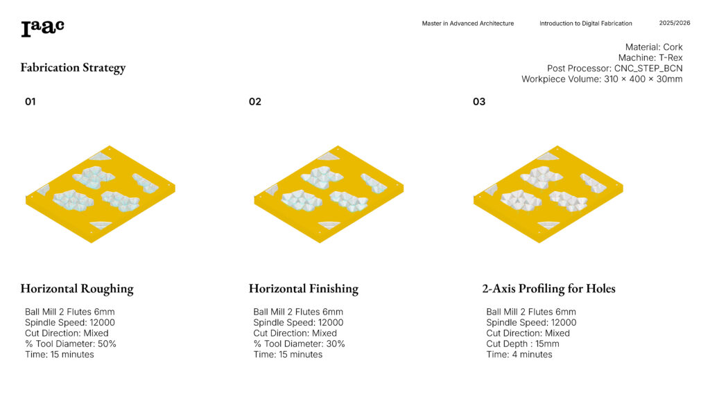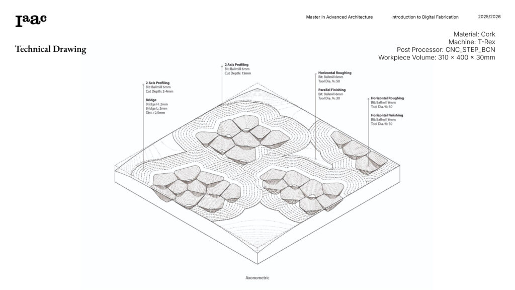 During the CNC Milling process, RhinoCAM software automatically creates bridges; a necessary milling process outside of commands that one might use to manipulate material. We began with the idea of testing the frequency and depth of 2-axis bridging path movement presets to create efficient and unique textures. Iterative physical testing and digital simulations helped us to develop a series of tooling methods with the CNC that focused on achieving organic geometries through sloping, variable finishing grains based on tool diameter percentage in step over, and our bridging texture. The malleability of cork proved most suitable for this fine grain experimentation to avoid chipping, resulting in a smooth finish resembling hand rendering on adobe.