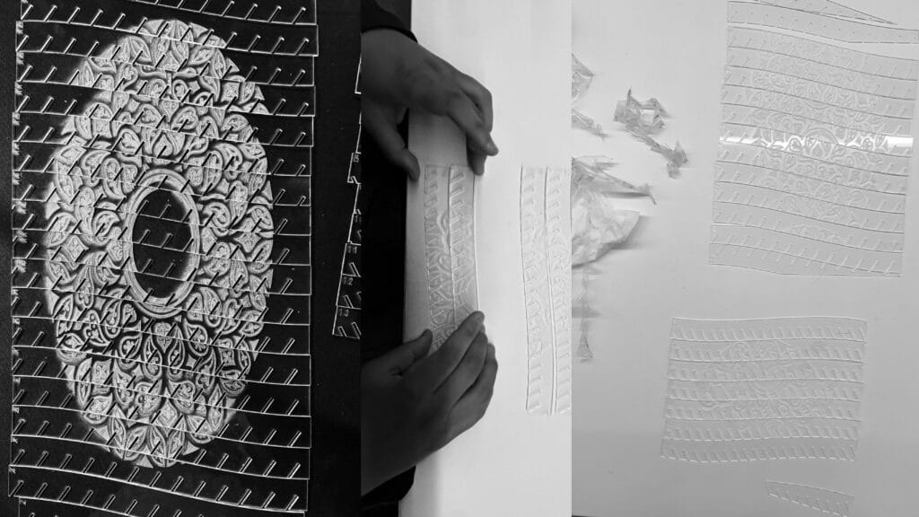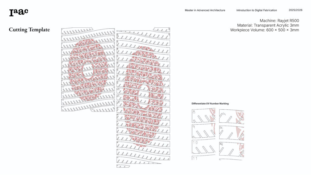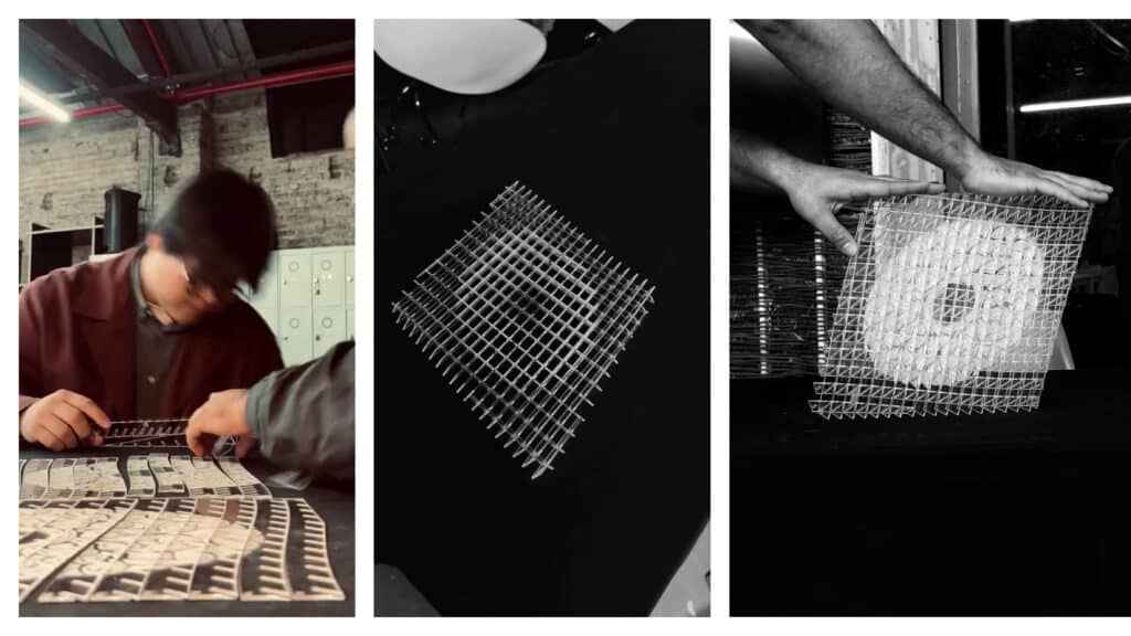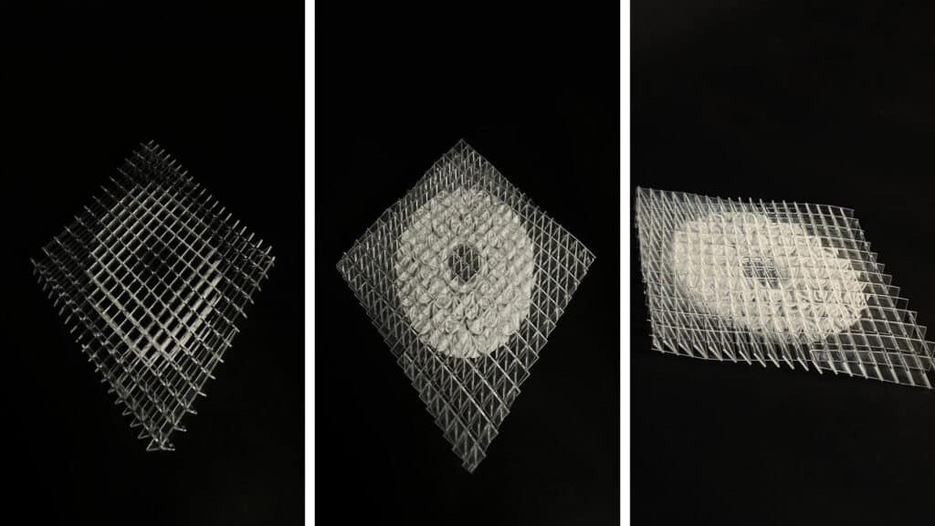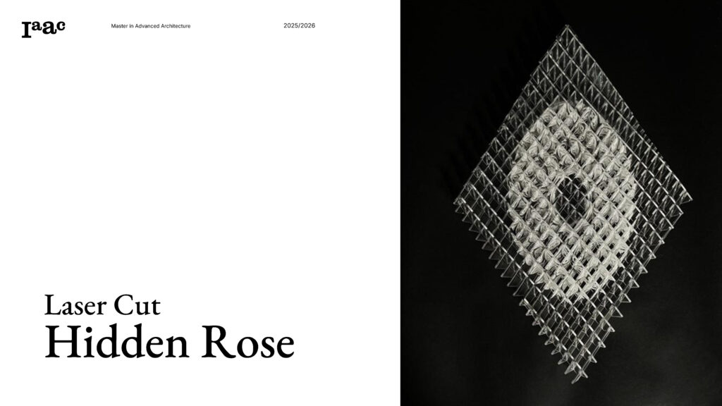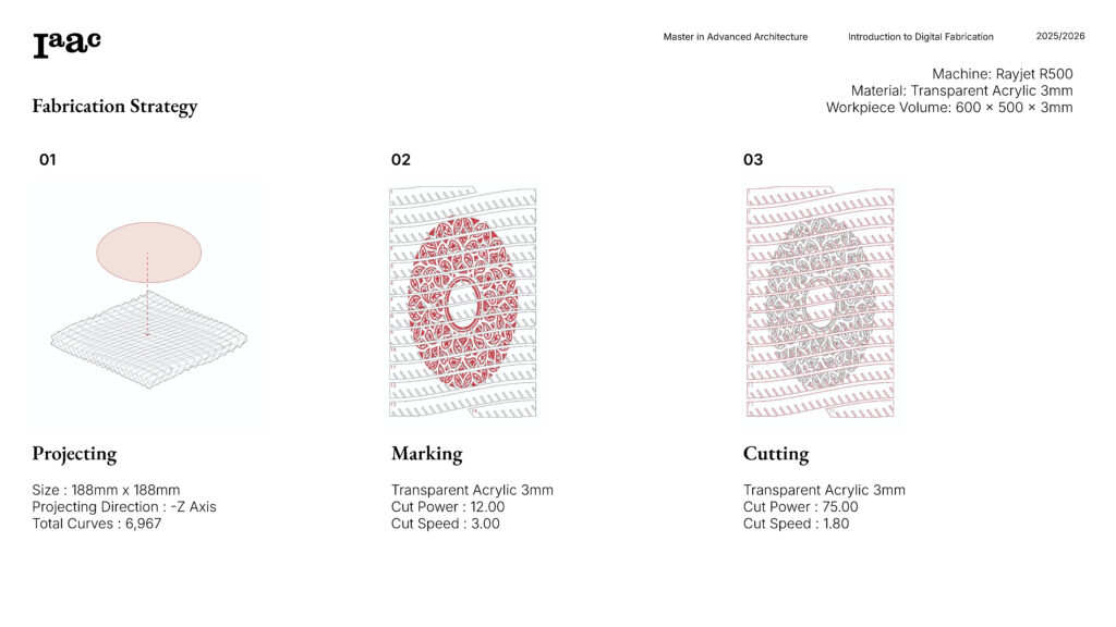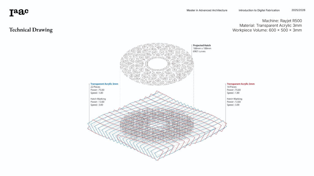 Waffling, the laser cut technique our team was assigned, is often seen as an exclusively structural process, turning 2D planes into 3D assemblies. In this process, the surface of the waffle assembly is often abandoned, or used as a frame for a superimposed facade. We were interested in how one might use rotated plane relationships found in waffle assemblies as an exterior projection surface for pattern geometries. Through digital iteration, we tested transparent assemblies that played with the eye, working with subtle cut curvatures and projection angles for engraved surfaces. Simulations allowed us to imagine how the viewer might see a 2D engraved pattern within the 3D assembly when looking from certain angles, with the pattern disappearing from another angle.