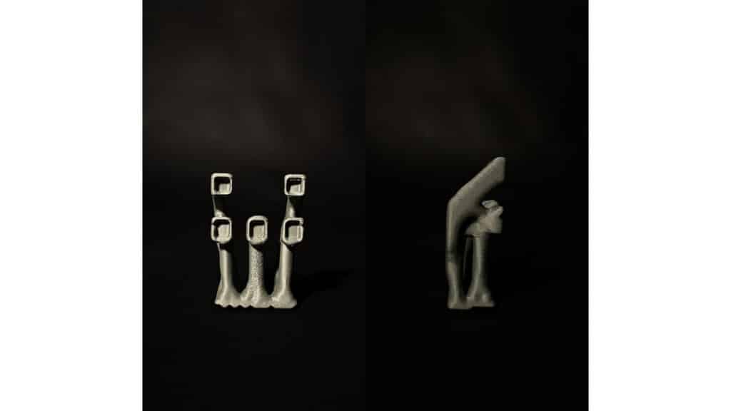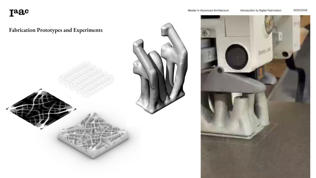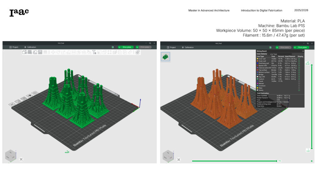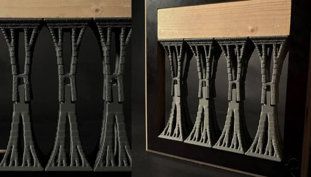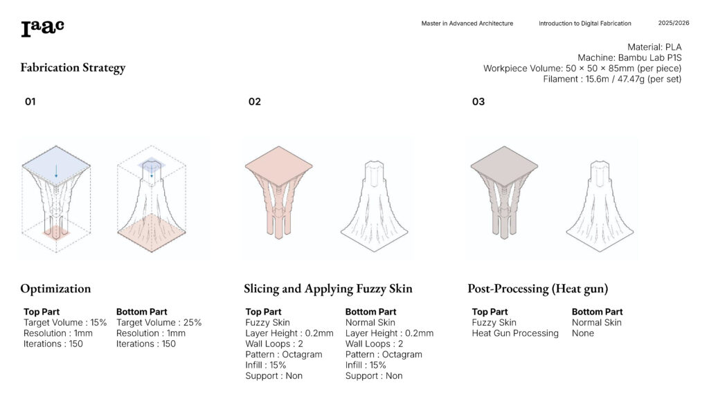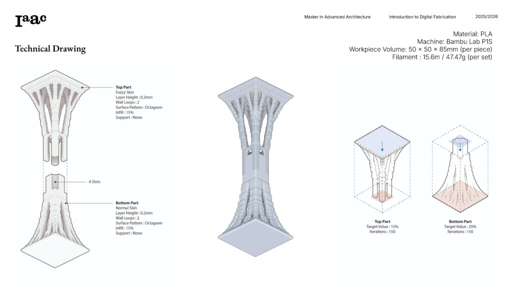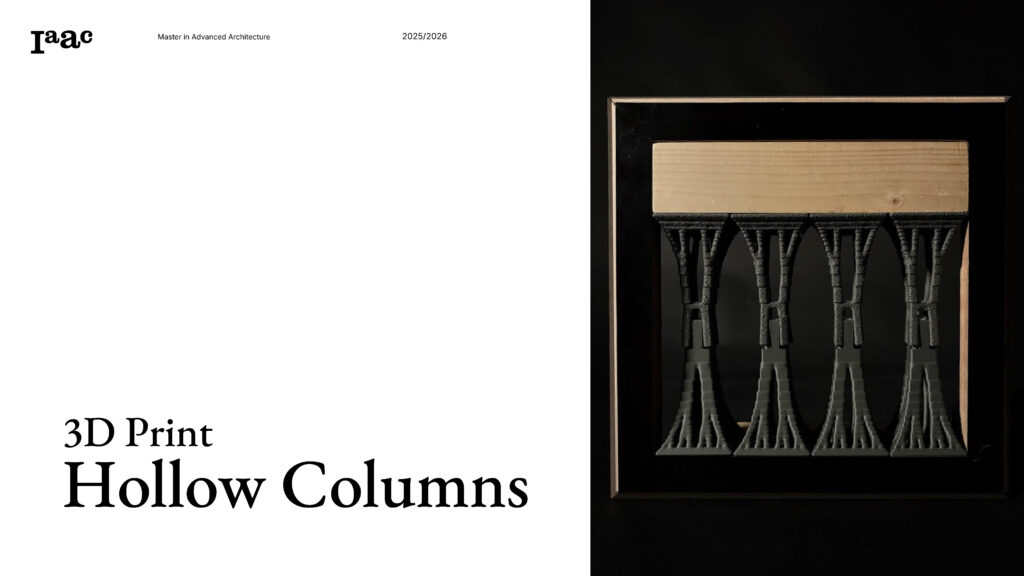 Material waste, geometry orientation, and strength are three factors that define 3D printed fabrication. Through extensive iteration, we sought to topologically optimise our geometry; to refine our material layouts within the Bambu printer bed parameters. Using the Millipede plugin for Grasshopper, we tested many optimised models, focusing on weight distribution. This method generated materially efficient geometries that required little or no supports when orienting the prints on the printer bed as a counter-force. Through this iteration, one can 3D print a colonnade assembly whose capitals and bases act as their own supports during the printing process. Reducing unnecessary material increased the geometric interest of our pieces, resulting in a novel, organic column order.