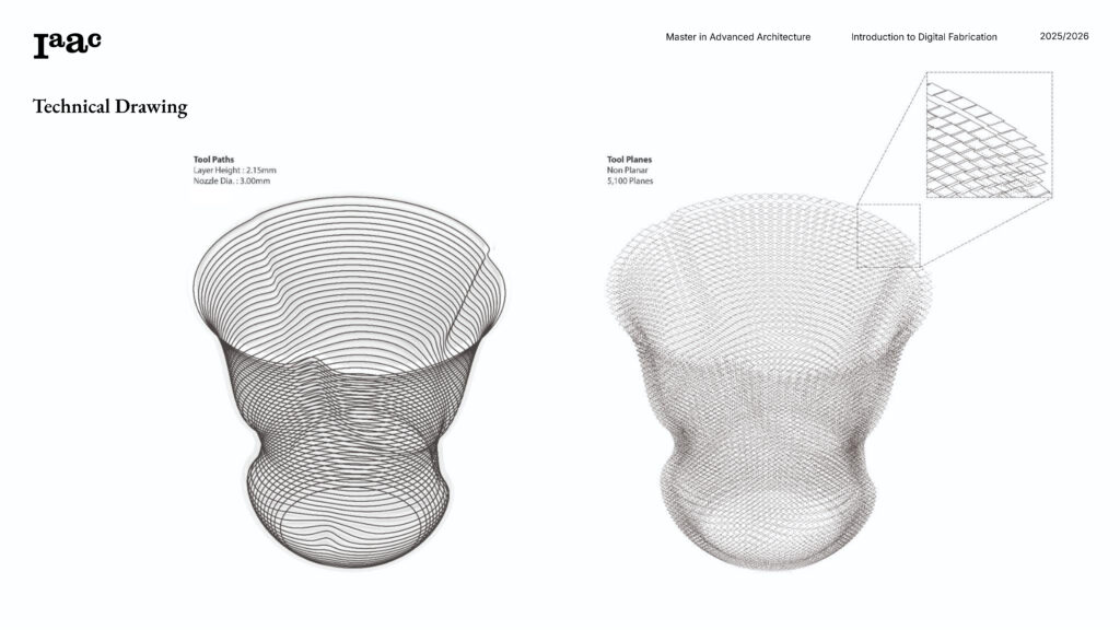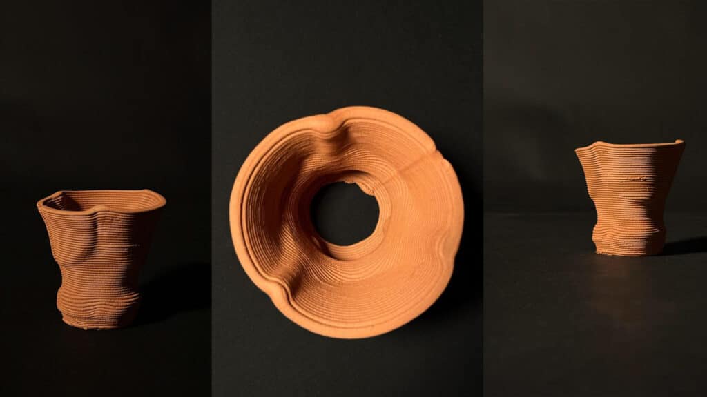Our team was interested in non-planar clay 3D printing and how we could utilise robotic movement to achieve lip curvatures similar to traditional, hand sculpted cups. We developed several digital prototypes based on these design goals, and tested their performance using Grasshopper digital robotic fabrication simulations. These digital prototypes began with direct copies of traditional cup silhouettes and became more experimental as we manipulated surfaces and played with textures. Through this project, we learned how to test our designed geometries with the robot simulation, to better understand the contouring capabilities, physical limitations of the robotic arm, and how to account for non-planar seams.