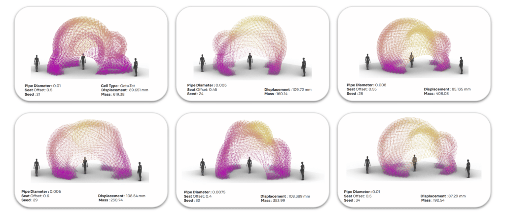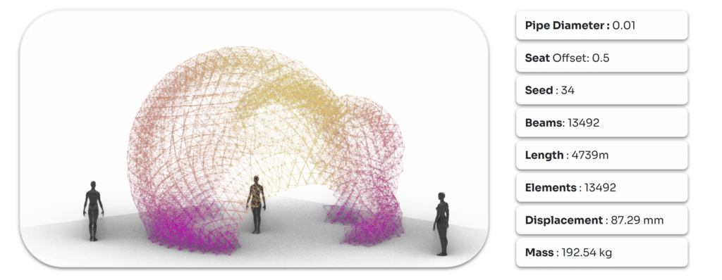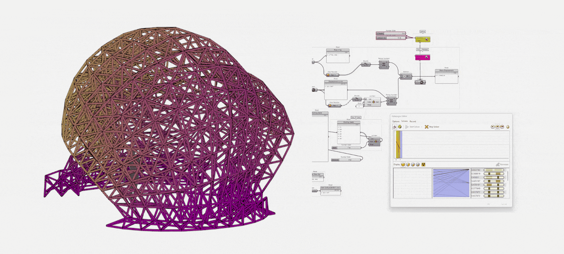 The second pass of optimization looks into the lattice structure. It was done using Galapagos, with genomes connected to the Crystallon lattice type and the number of mesh layers.