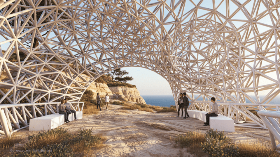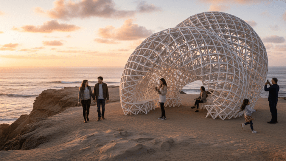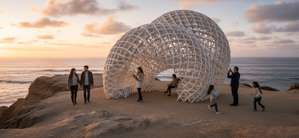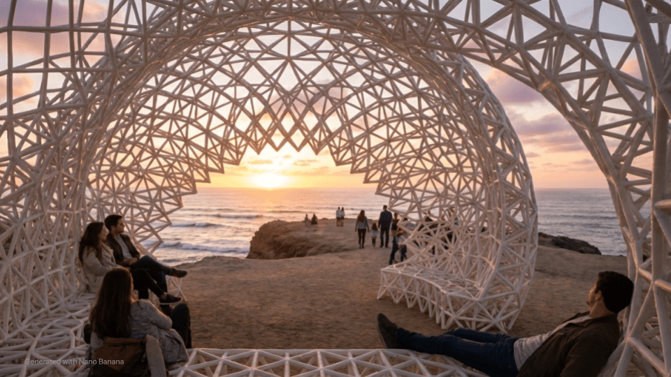 This project presents a parametrically designed 3D-printed pavilion for San Diego, drawing formal inspiration from the erosion patterns of Sunset Cliffs. The pavilion serves as a multifunctional public space that accommodates dining, seating, and social interaction. Our computational methodology integrated form-finding processes with voxel crystallization through Crystallon, structural analysis via Alpaca4D including wind load considerations, and system optimization using Galapagos. The resulting design demonstrates how advanced parametric tools and additive manufacturing can translate natural landscape phenomena into functional public architecture that responds to both environmental forces and community needs.
