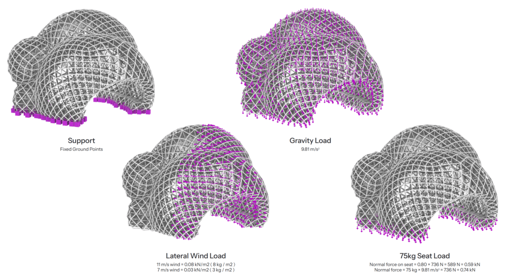 To analyze the structure using Alpaca, the lattice nodes in contact with the ground are defined as fixed supports, and gravity loads are applied. Wind loads are also introduced, considering that the dominant winds in San Diego come from the west–northwest (WNW) from the Pacific Ocean, with typical velocities ranging between 3 and 7 m/s. For the analysis, a wind speed of 11 m/s is applied to provide an appropriate safety margin. Additionally, seating loads are included to account for user occupancy.