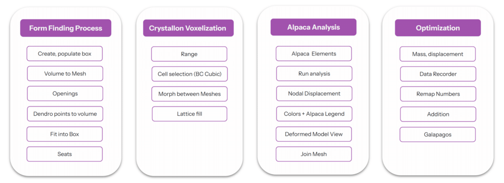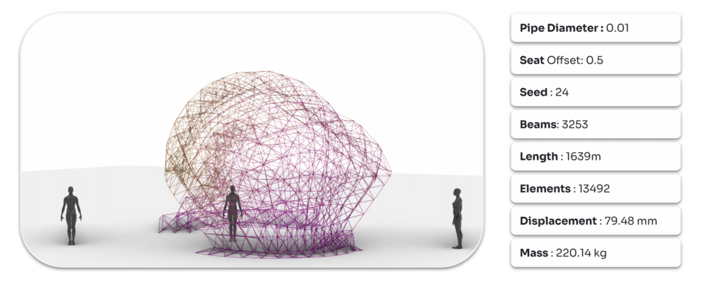 Form finding starts with populating points which becomes the center of our spheres. The spheres are joined together with dendro from whish we get our mesh that is then refitted in the 8x8x6 box. Then the entry and exit are defined. The mesh is quad remeshed with a guide set at 27 inches that is also used to select the bottom faces of the mesh which is offsetted for the seats.