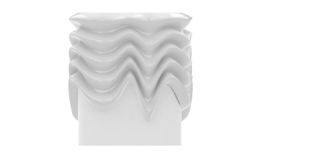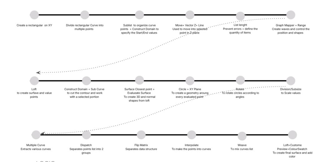 The façade is a dynamic, kinetic system composed of wave-based panels whose curvature shifts throughout the day. Its movement follows a sine curve along the x-axis, generating varying amplitudes and continuous flowing motion across the entire surface.
