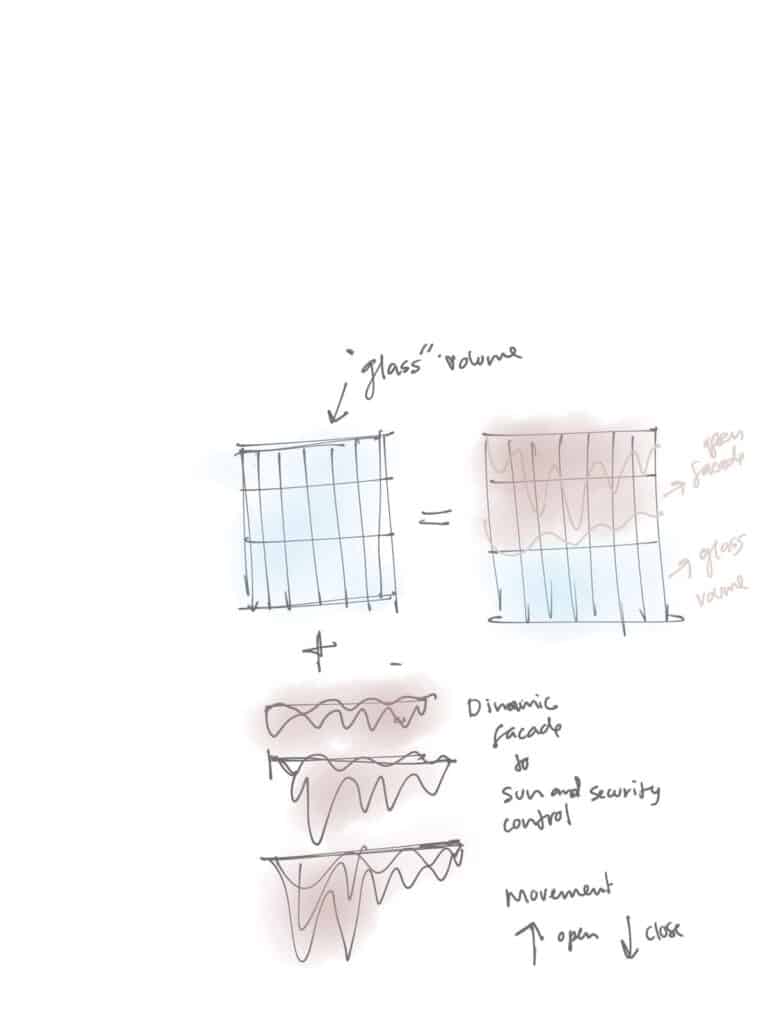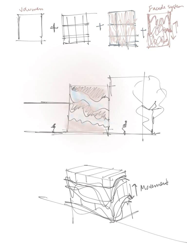 The façade is conceived as a textile surface caught mid-movement, as if a piece of fabric were lifted by the wind and suspended in time. Waves, folds, and subtle curvature translate the softness of cloth into a controlled architectural geometry. This fluid motion becomes the organizing logic of the elevation, producing a rhythm of peaks and troughs that modulate light, shadow, and transparency. The building becomes a frozen breeze an envelope shaped not by rigid lines but by the natural choreography of wind acting on fabric.