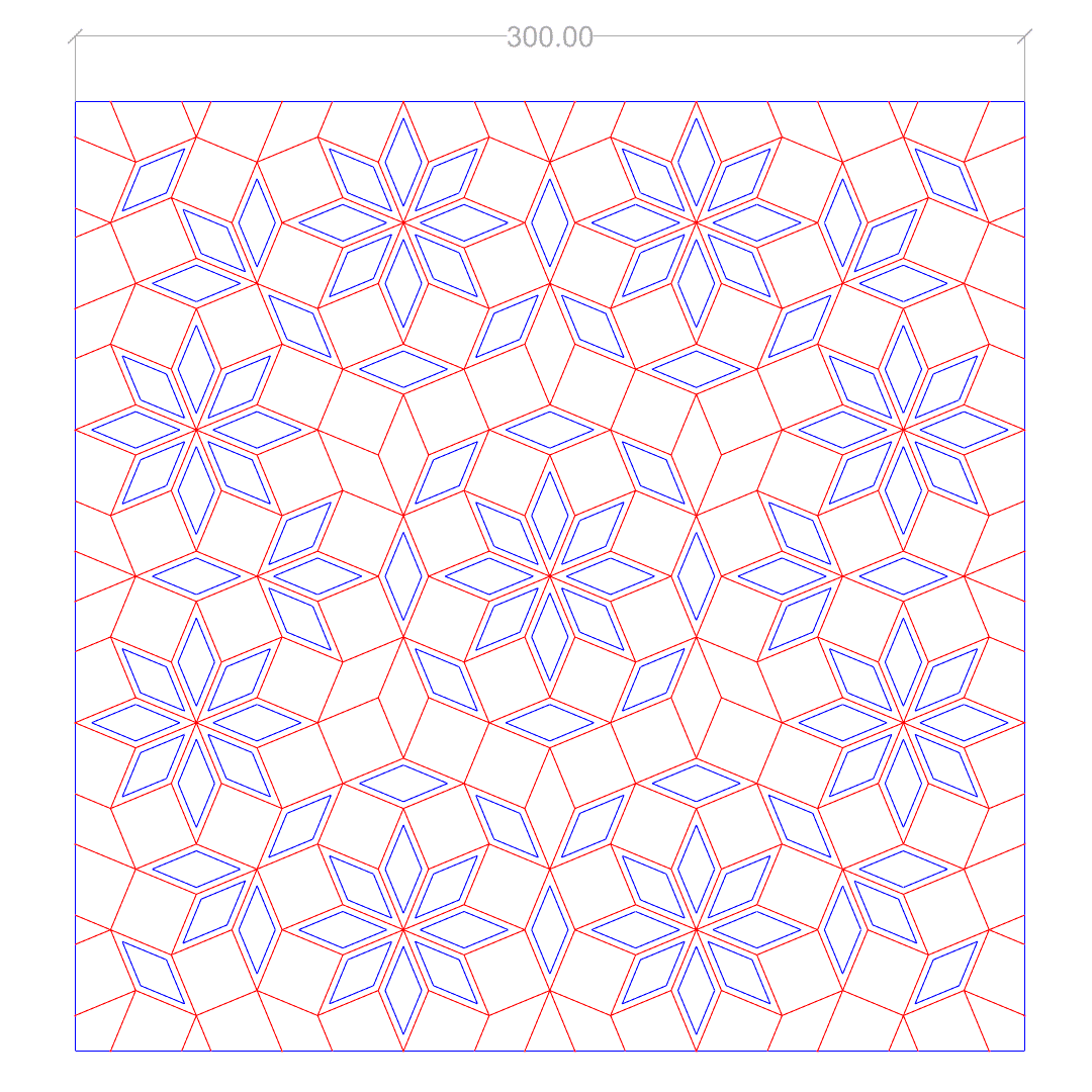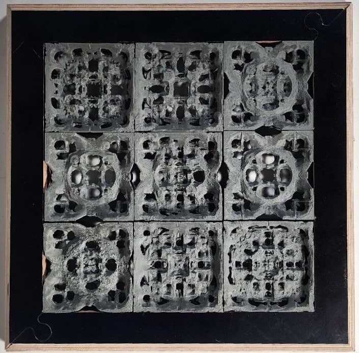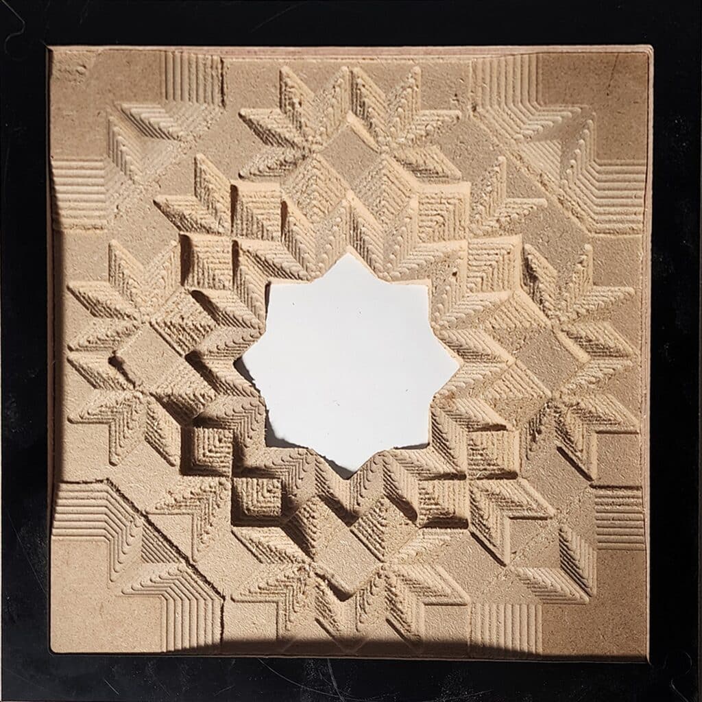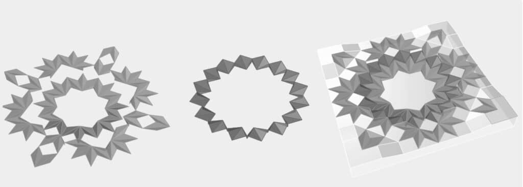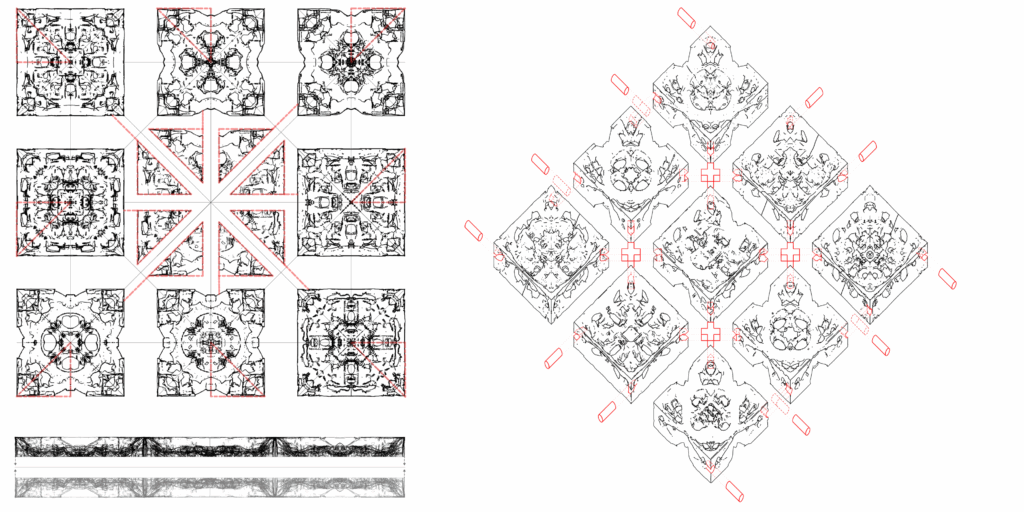 The tile geometry originates from an intentionally chaotic and irregular initial morphology. This seemingly disordered form was then subdivided into eight equivalent segments, whose systematic mirroring generated a coherent set of eight regular tiles. In this way, an ordered configuration emerges directly from the manipulation of the initial chaotic geometry.