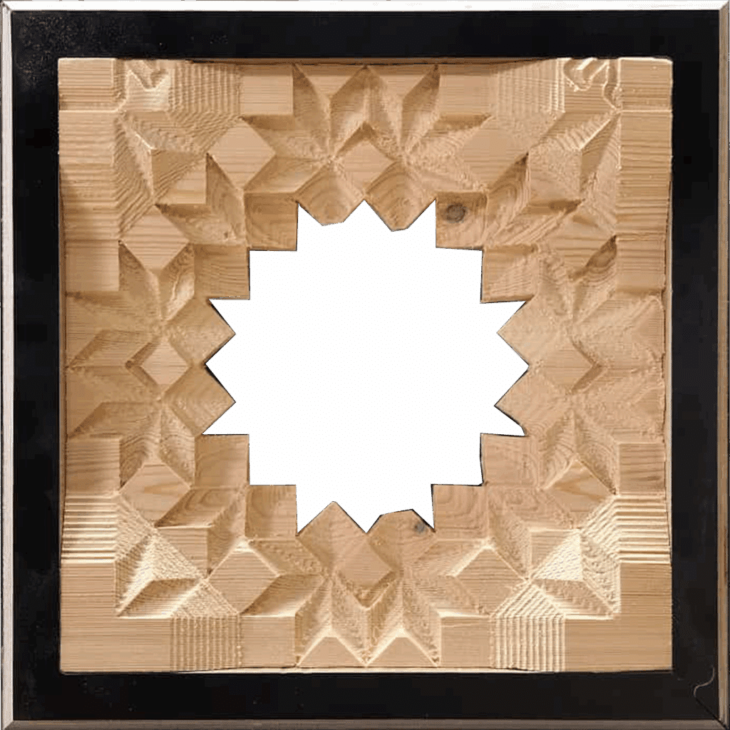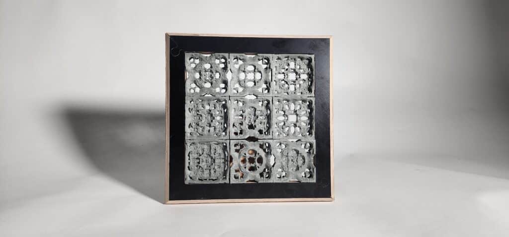 The structural system is maintained through two distinct types of dowels. Cylindrical dowels anchor the peripheral tiles to the wooden frame, while cross-shaped dowels connect the central tile to the surrounding tiles at each corner, reinforcing the overall ordered assembly derived from the original irregular form.
