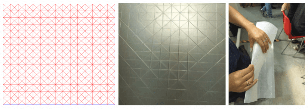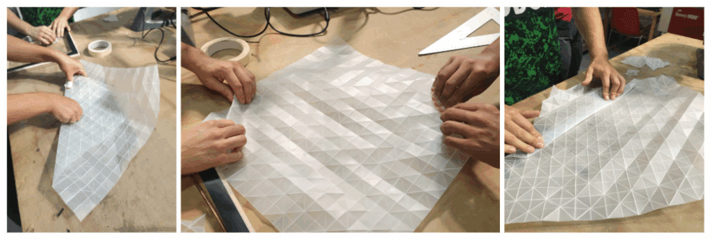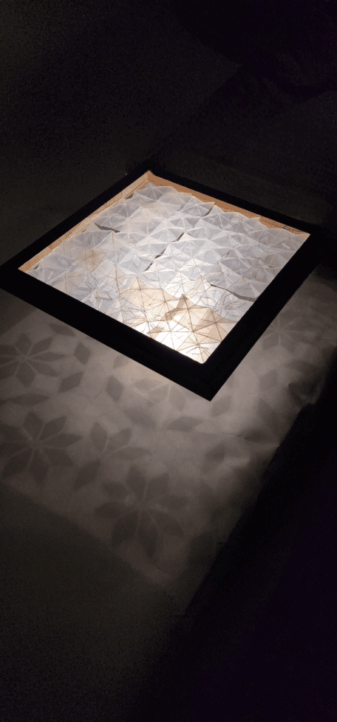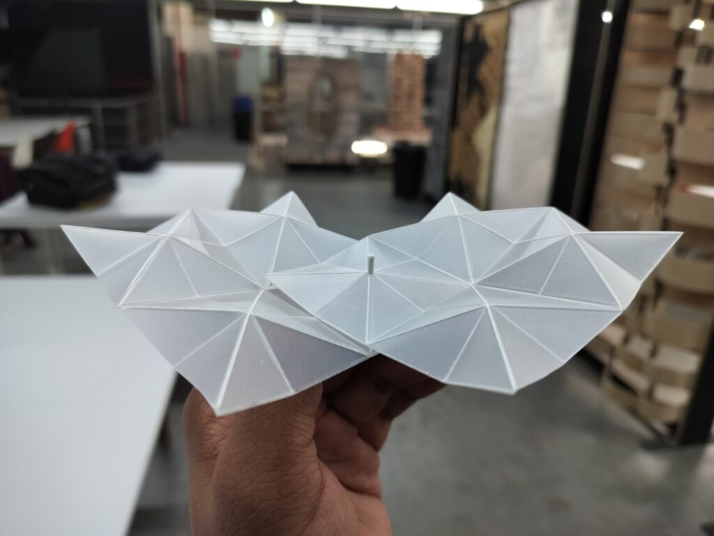 Light becomes an active element of the composition: the translucent facets diffuse illumination, while the varied angles of the folded surfaces cast shifting shadows throughout the interior of the frame. This dynamic interaction emphasizes the contrast between the precision of digital fabrication and the expressive dimensionality of hand-formed material. The work operates simultaneously as a material study, geometric investigation, and spatial composition, demonstrating how computational patterning and fabrication technologies can produce nuanced, atmospheric physical forms at architectural scale.