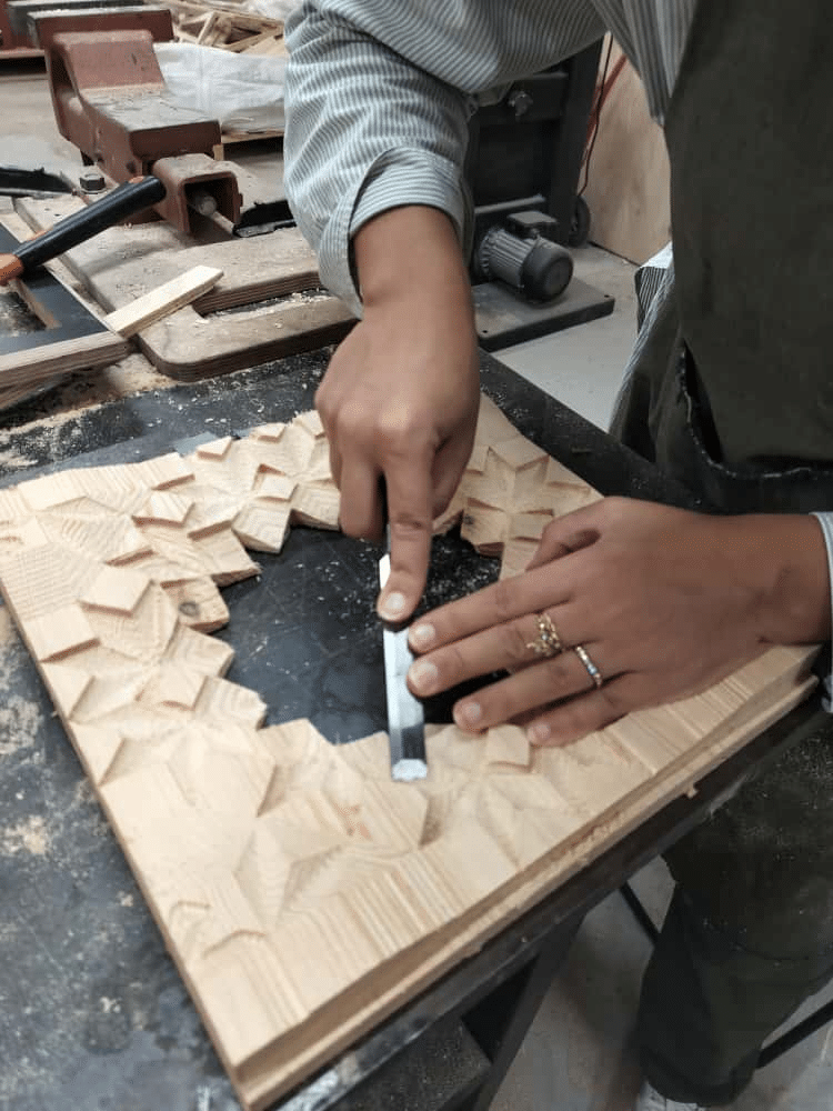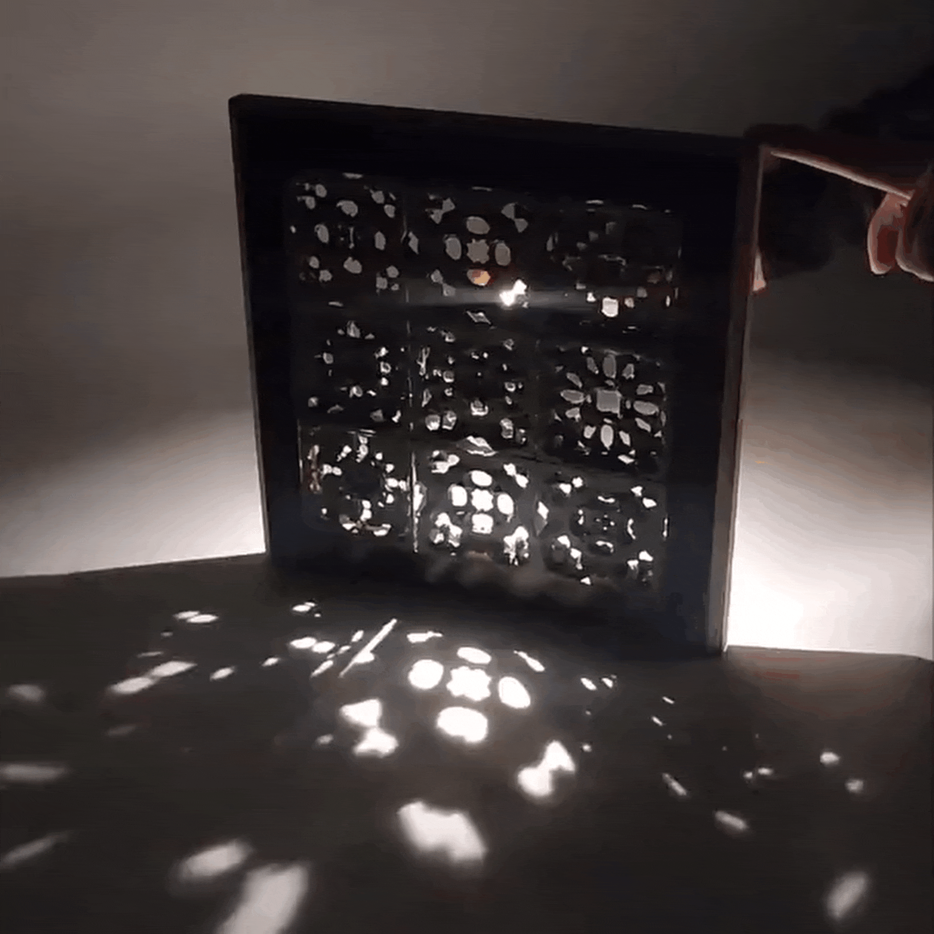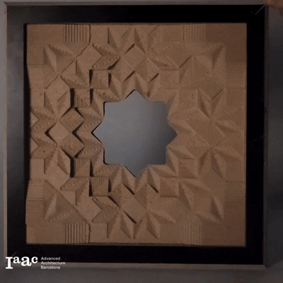 A traditional mashrabiya is an architectural feature consisting of a projecting oriel window with a carved wooden lattice screen, common in Islamic architecture, especially in the Middle East and North Africa. It serves the dual purpose of providing privacy by obscuring the interior while allowing filtered light and airflow to enter, and of facilitating passive cooling by catching wind and holding water jars that use evaporative cooling. Origami symmetrical patterns were also an inspiration for the folds.