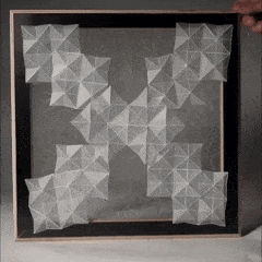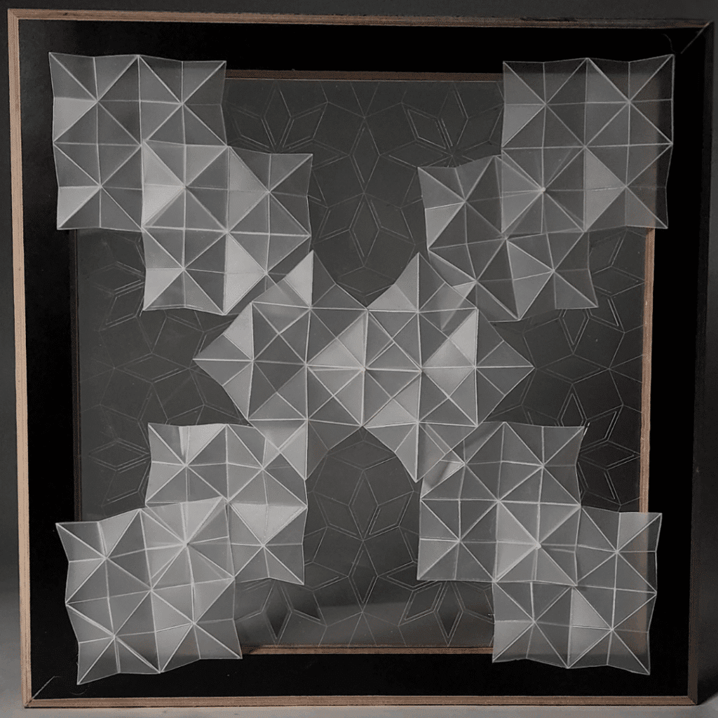 The design is derived from a triangular tessellation system generated through parametric modeling. Each module is laser-cut from translucent polypropylene and manually folded to produce a low-relief topography of peaks and valleys. These folded units are strategically arranged across the frame to form a centralized, symmetrical field, suggesting growth, aggregation, or crystalline emergence. The base acrylic layer features a subtle, laser-cut version of a different tessellated pattern, establishing a calm, two-dimensional base that anchors the raised modules.