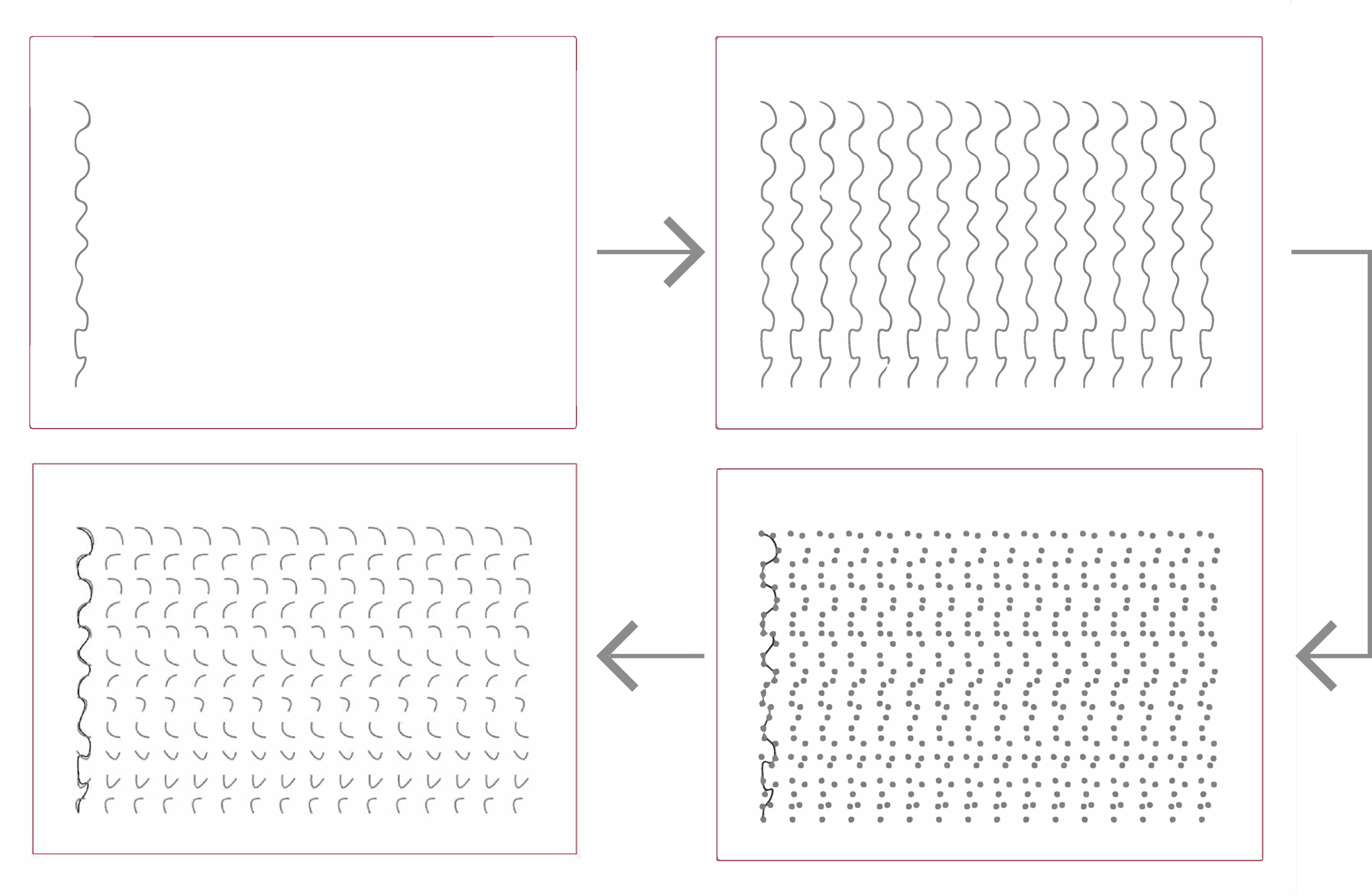 The workflow continues by creating a base curve in Rhino and repeating it within the workspace to generate the overall layout. The base curve is then subdivided into equal intervals, producing sets of three-point curves used to compute precise stroke trajectories. These trajectories establish the geometric framework that guides the ABB-140’s controlled brush movements.
