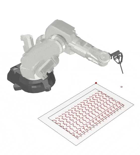 Finally, a simulation was generated to visualise the robot’s expected output. This preview allowed the team to evaluate how the computed tool path would translate into real brush movements, identify potential errors, and confirm that the planned trajectories, orientations, and material interactions would perform correctly before executing the process on the robot.