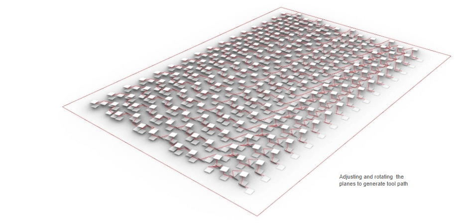 Next, construction planes were generated at every point derived from the three-point curves, establishing localised coordinate systems for defining brush orientation. The axes of these planes were then remapped, enabling controlled adjustments in rotation and height. By gradually varying these parameters, a series of distinct trajectory profiles was created, each influencing the brush’s movement behaviour. These planes were subsequently connected and interpolated to form the final continuous tool path. This path provides the geometric and orientation framework needed for the paintbrush to glide smoothly through the workspace under the programmed motion of the robot.