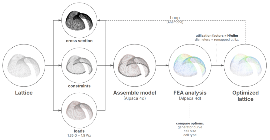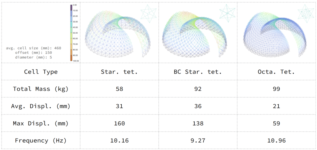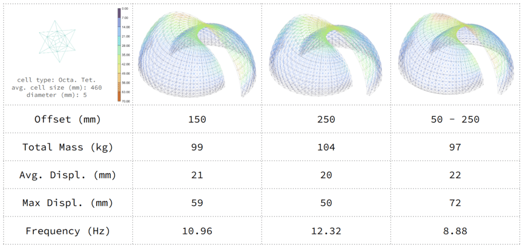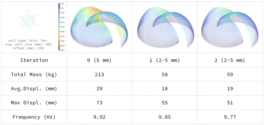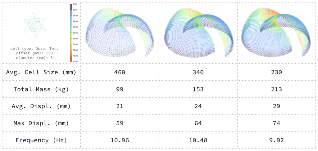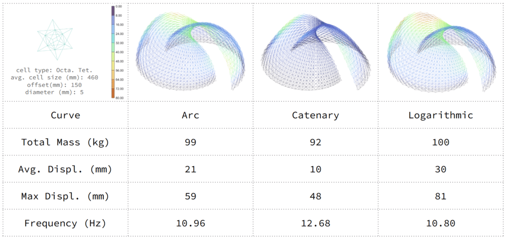 We chose not to use evolutionary solvers, as our aim was to gain a clear understanding of how changes at different scales — from overall geometry to cell topology — affected structural behaviour. Studying parameters independently allowed us to isolate their impact, even if it did not provide a complete picture of how they interrelate. It is also worth noting that the initial form was relatively fixed, shaped both by the brief constraints and by our design intentions.