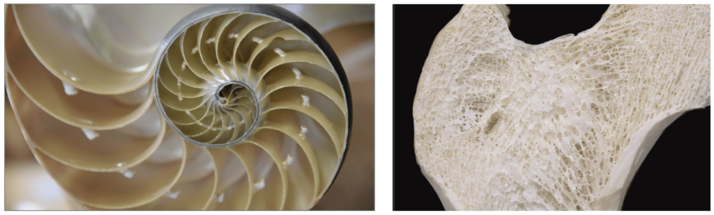 Left: Nautilus shell / Right: Trabecular bone’s internal structure