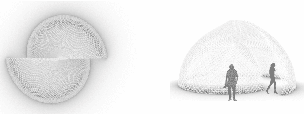 Inspired by biology — the nautilus shell’s logarithmic spiral and trabecular bone’s porous orientation— we developed a pavilion that unfolds as a continuous spiral path.