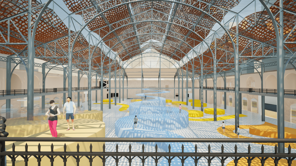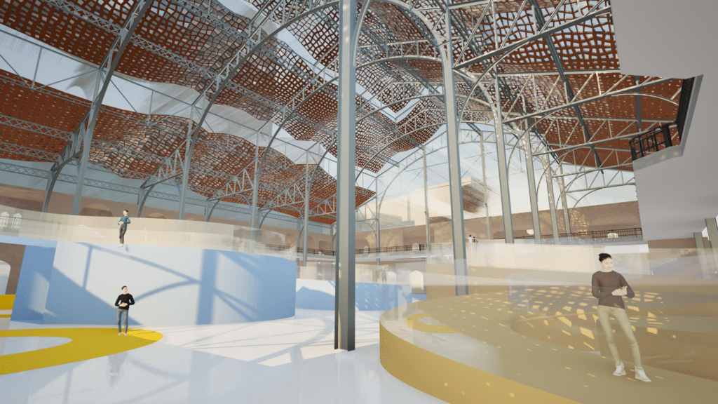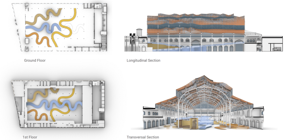 Applied to the market roof, this strategy transforms the initially flat surface into a highly expressive structure, with openings strategically aligned to the flows beneath.