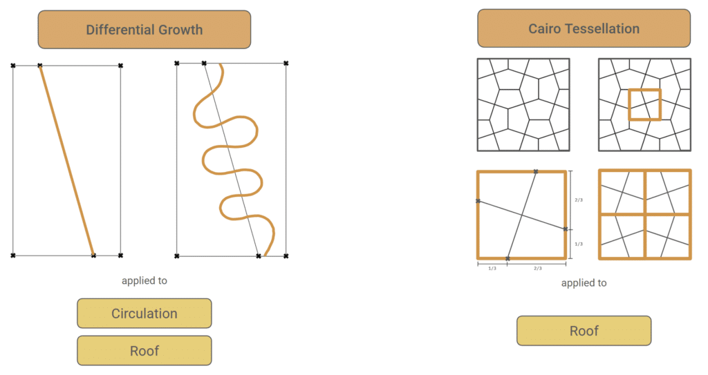 The design is founded on two main concepts. The first is differential growth, a natural process capable of generating smooth and organic geometries. This principle informs both the circulation system and the roof geometry, allowing the spatial configuration to evolve organically. The second concept is the Cairo tessellation, a traditional paving pattern widely used in the city. This pattern was reconstructed parametrically, starting from a square geometry and then mirroring it. The resulting flat module is used to tessellate the roof surface, establishing a strong connection between contemporary computational methods and local architectural heritage.