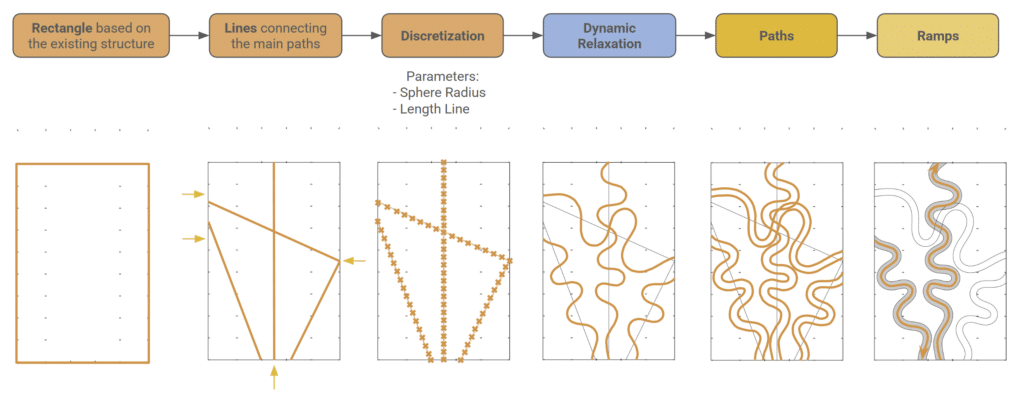 The circulation layout originates from the rectangle based on the existing steel structure. Initial lines connect the four primary entrances of the building and align with the main longitudinal axis. These curves are discretized and processed using dynamic relaxation in Kangaroo, with simulated sphere collisions. Through relaxation, the curves evolve into smooth polylines. Then, offset operations define circulation widths and generate the main market paths. Finally, two of these paths are vertically displaced, creating continuous ramps that connect the ground floor to the first level. The volume generated beneath these inclined paths is utilized for storage and commercial spaces.