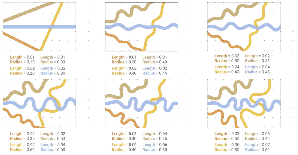 By varying the parameters of the line length and circle radius, it is possible to explore different amplitudes and frequencies of the curves. The final result allows finding paths that elegantly avoid the existing structure with fluid movement.