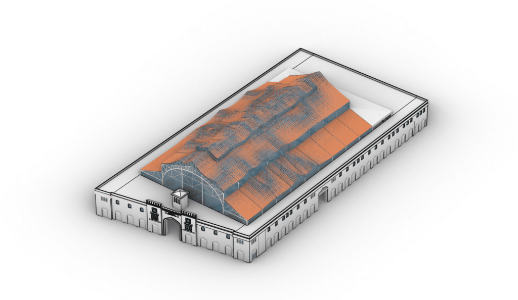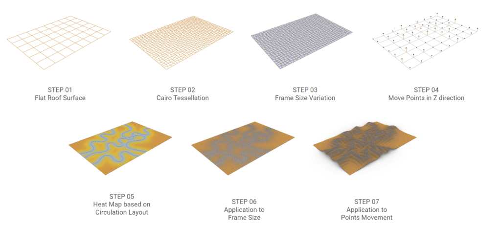 For the roof geometry, the design process begins with a flat mesh onto which the Cairo tessellation is mapped. The frame size of the pattern is variable, and vertical displacement of the mesh vertices introduces additional dynamism to the surface. These variations are driven by a heat map based on proximity to the main circulation paths: roof areas closer to the circulation zones feature smaller frame sizes and greater vertical deformation.
