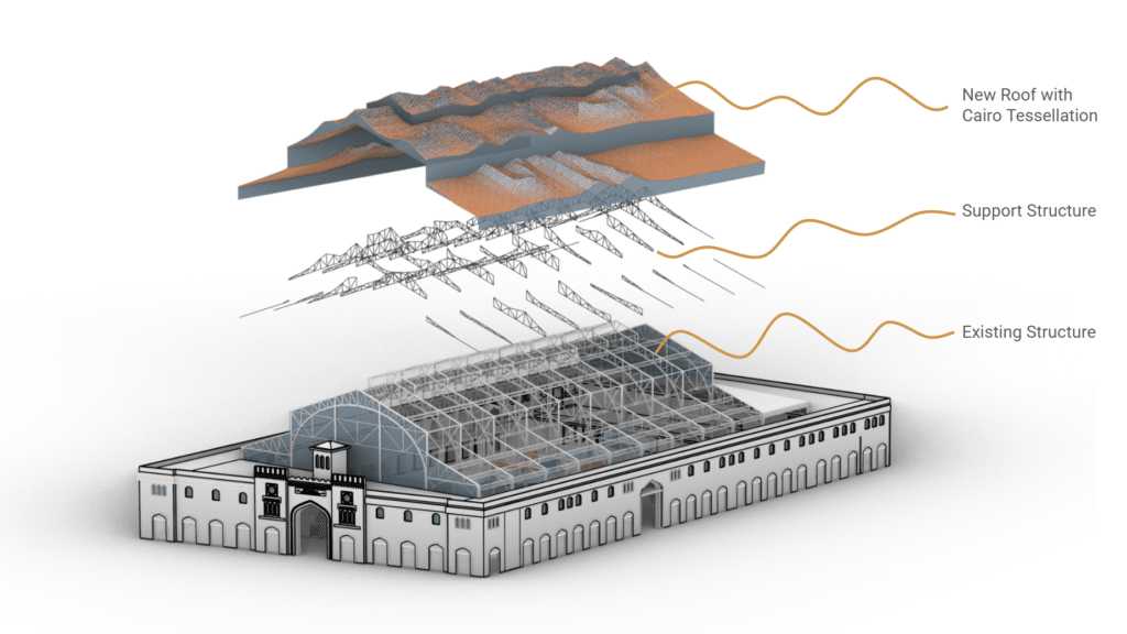 The project focuses on the transformation of the historic Bab al-Luq Market in Cairo, Egypt. Built in 1912 and inspired by Paris’ Les Halles, the market was distinguished by its accessibility, natural light, hygiene, and spatial organization. Despite continuous use, decades of deterioration have reduced its architectural and spatial potential. The project aims to reactivate the market through the design of a multi-level shopping environment driven by optimized circulation strategies and a new parametric roof system, in which openings and tiling are computationally controlled to generate functional and expressive light and shadow patterns.