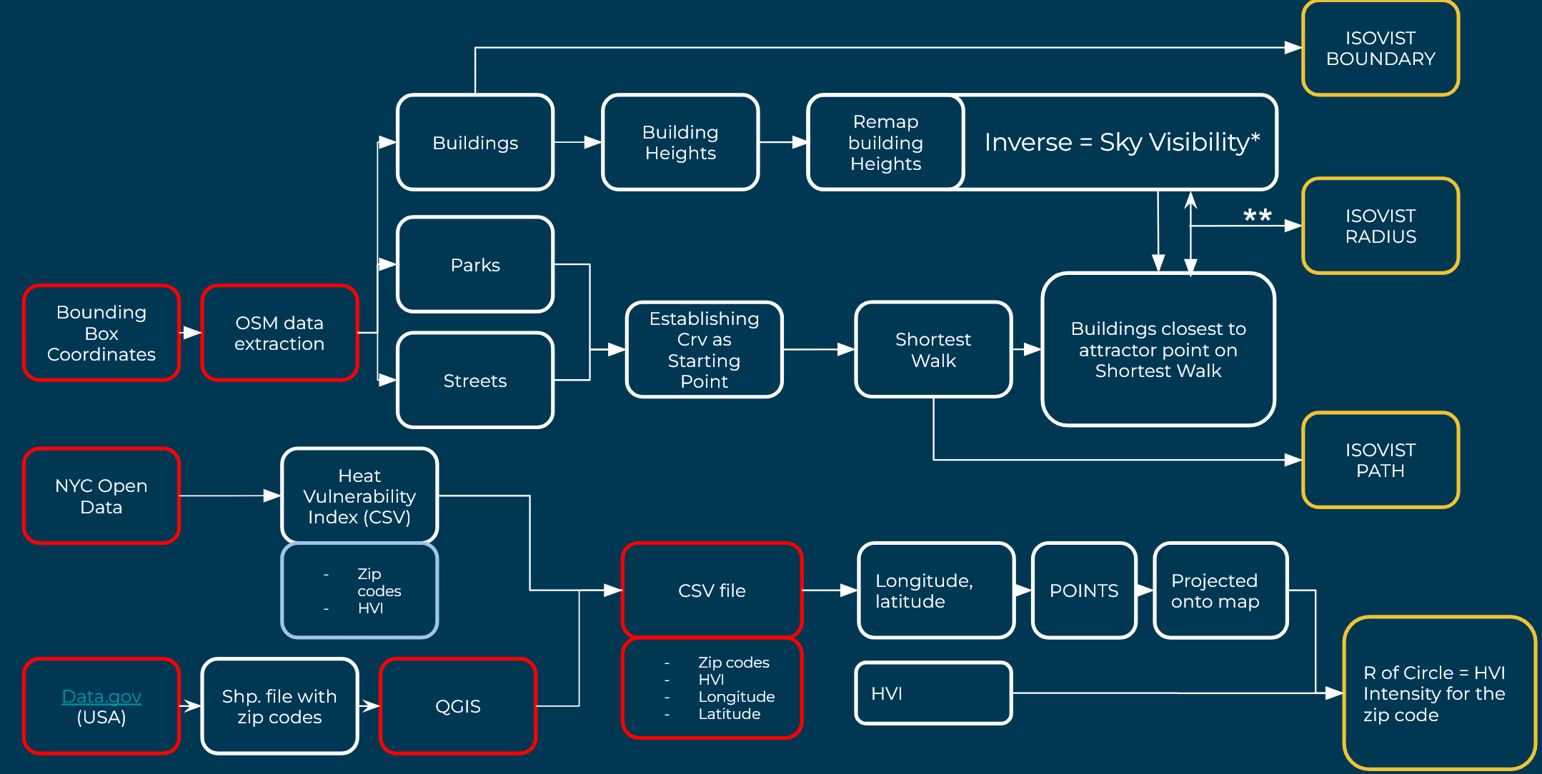 The aim of the project is to map the sky visibility in New York City as one walks from one public park to another with an added analysis layer of Heat Vulnerability Index (HVI) to neighbourhoods.