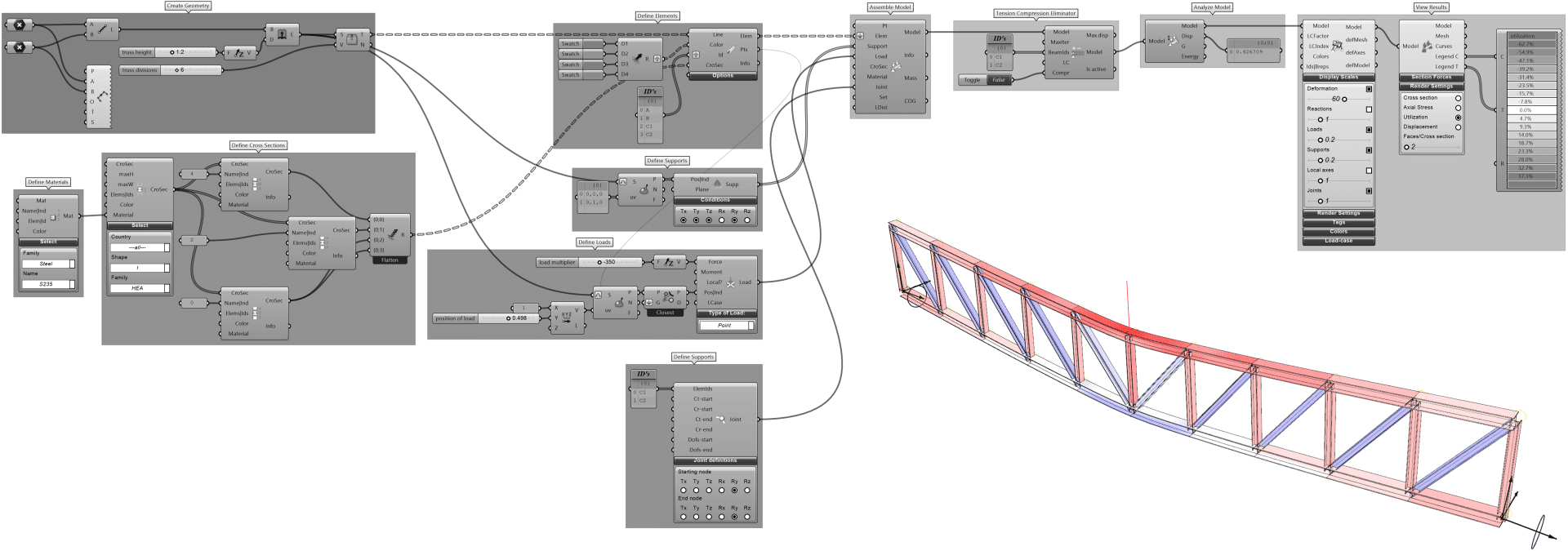 Karamba3D is a plug‑in embedded in the parametric environment of Grasshopper3D within Rhinoceros3D. This integration makes it possible to combine parameterised geometric models, Finite Element calculations, and optimisation algorithms such as Galapagos, Octopus, and Wallacei.