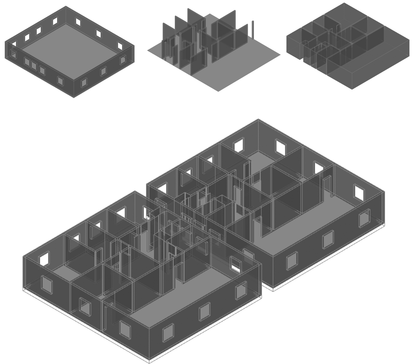 Once the SVG files were prepared, they were imported into Rhino and referenced in Grasshopper. We developed a workflow that combined the three SVG types—walls, room types, and doors—while performing data cleaning, line intersection, and alignment operations. This combination formed the basis for generating 3D IFC-ready models.