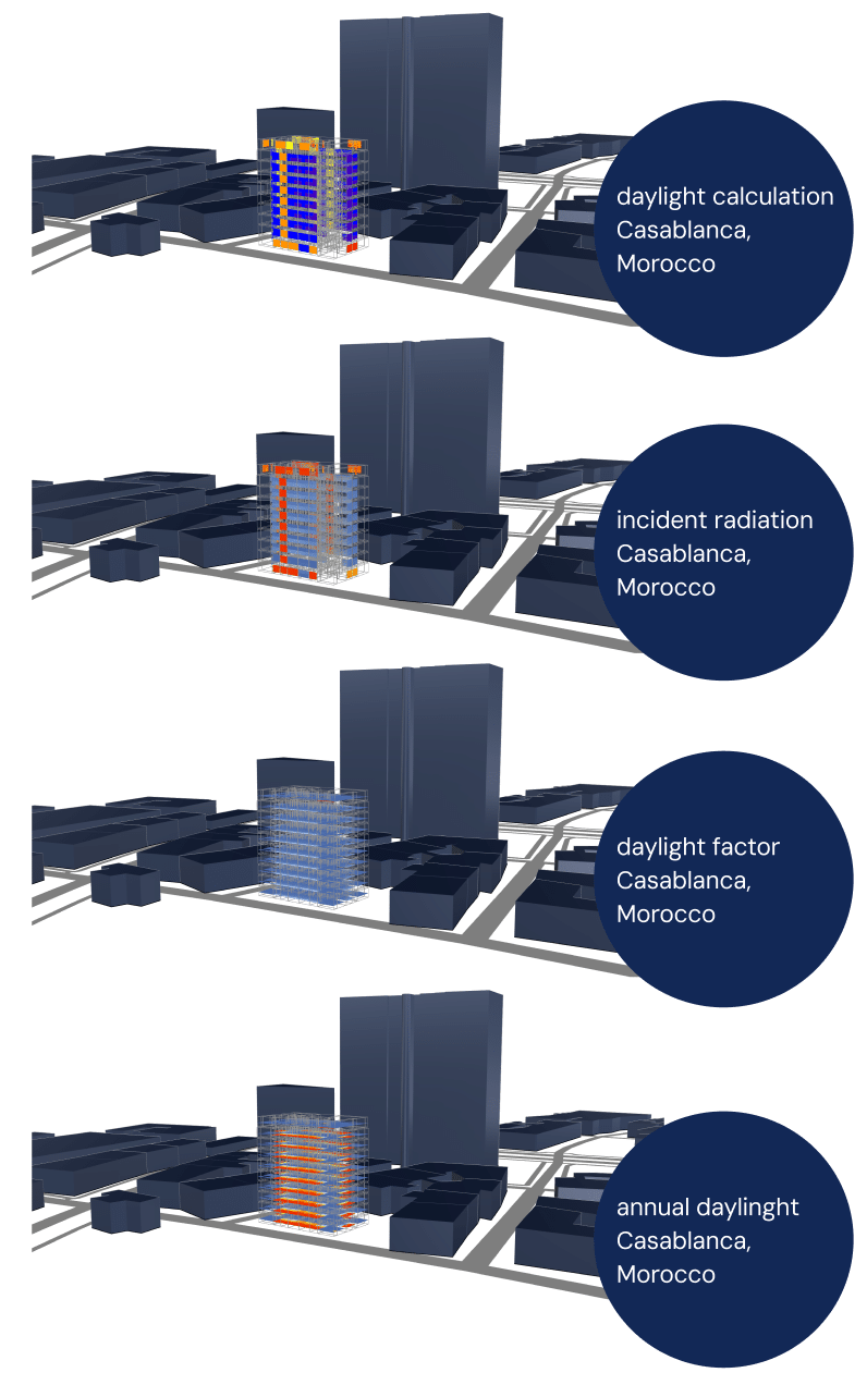 For rooms, we performed daylight simulations, including annual daylight availability, using custom sensor grids at 1-meter spacing. This provided a consistent and comparable basis across different layouts. As with windows, the results were exported and stored systematically for each room.