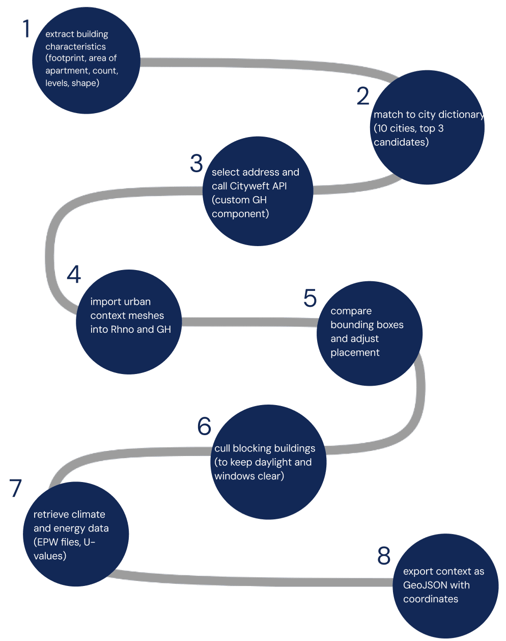 Integrating urban context was a crucial step in our workflow, as it enabled us to place buildings within realistic surroundings and run environmental simulations that depend heavily on context. Since the dataset we used did not provide georeferenced locations, we designed a method to systematically assign each building to a suitable city and neighborhood. The process started by analyzing the bounding box and geometric characteristics of each building.
