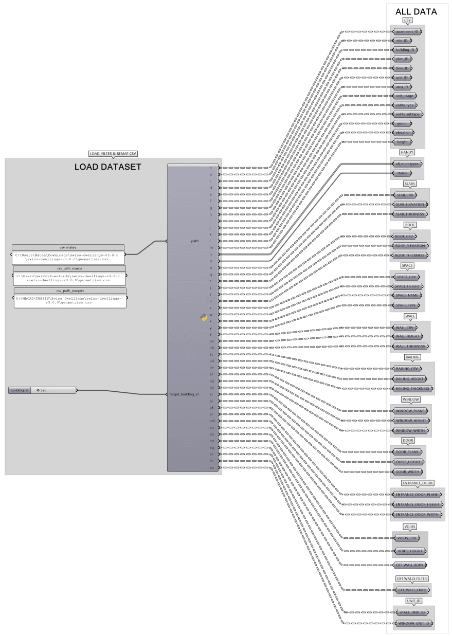 To retrieve and prepare data from the Swiss Dwellings dataset, we developed a custom Grasshopper Python component that reads the CSV files, extracts the required fields, restructures them, and outputs workflow-ready data. This step forms the foundation for all downstream tasks, including IFC authoring and simulation model generation.