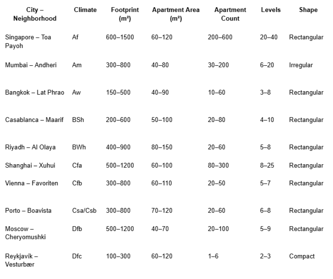 This selection covers a wide range of climate zones, from tropical rainforest and monsoon climates to semi-arid, temperate, continental, and subarctic conditions. For each city, we also defined neighborhood characteristics such as building footprint, apartment area, number of units, building height, and shape, ensuring that the inserted models reflect realistic urban typologies. By situating our buildings in these diverse climates, we can analyze how environmental variables—like solar radiation, daylight, and seasonal temperature variations—affect design outcomes, enabling our dataset to capture a broad spectrum of real-world performance contexts.