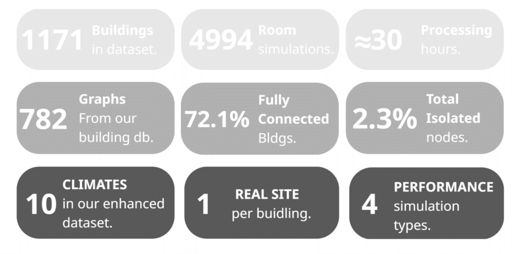 As of this booklet the corpus is partially built and validated. We’ve reconstructed and simulated 1,171 buildings, producing 4,994 room-level simulations across 10 climates, with one real site per building and four performance simulation types. End-to-end processing for the verified subset took about ≈30 hours. From these runs we compiled 782 building graphs; 72.1% are fully connected and only 2.3% of nodes are isolated—useful baselines for connectivity and data quality going forward.