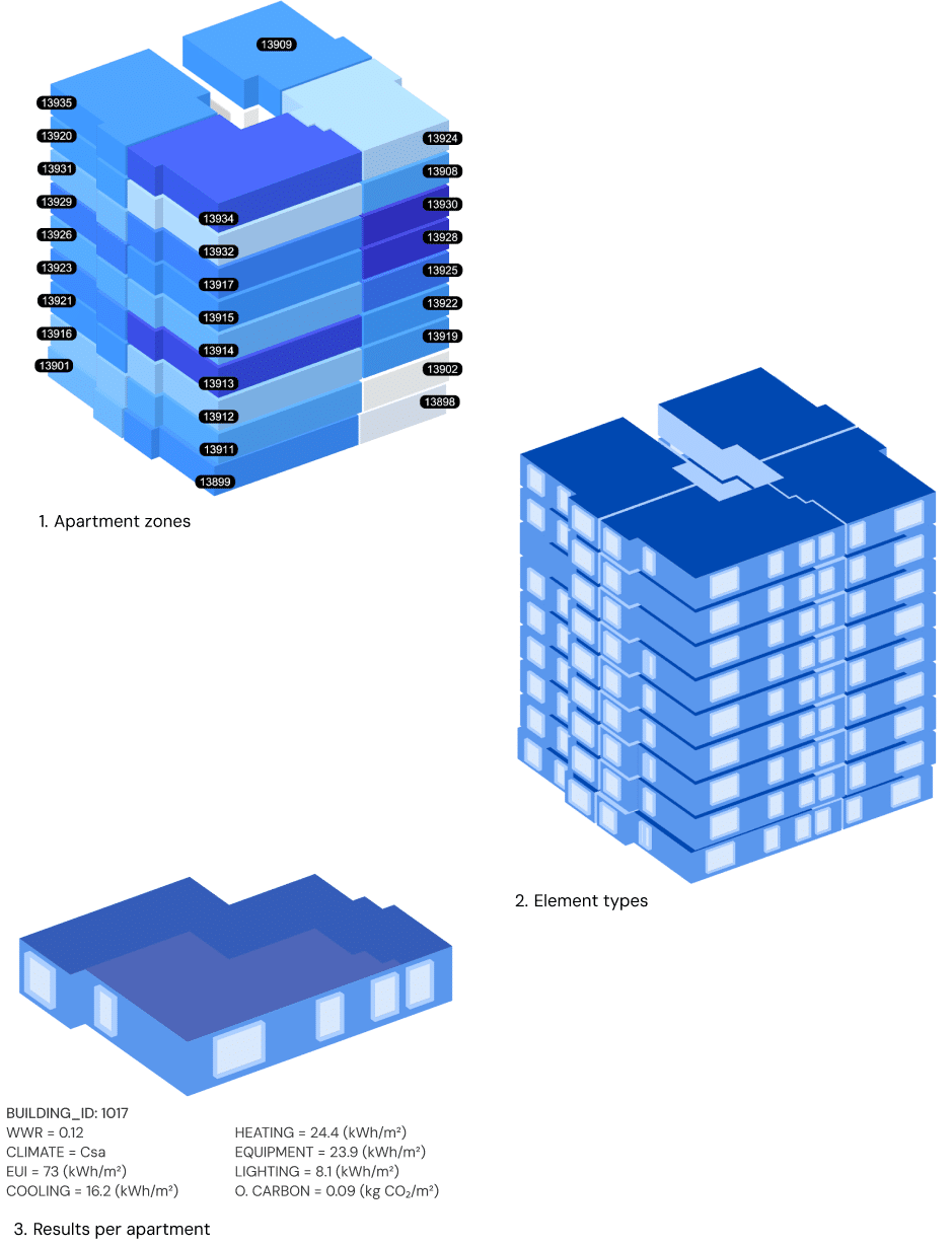 Property Sets: stable keys (building/storey/unit/space/element IDs) and centroid X-Y-Z for joins, plus our simulation summaries on rooms and windows (e.g., daylight/solar metrics and WWR). The result is a self-contained, queryable model that opens in standard BIM viewers and analysis toolchains, and that lines up one-to-one with our CSV tables and graphs for downstream analytics and ML.