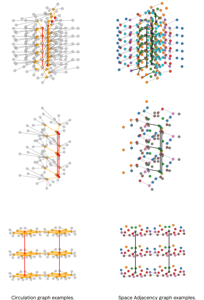 Finally, we export the graphs in CSV tables (nodes/edges), GraphML for interoperability, and a pickle/NetworkX snapshot for fast analysis, alongside simple QA reports that flag isolated spaces, unreachable components, and count mismatches between adjacency and circulation. The result is a pair of building graphs that are reproducible, queryable, and ready to cross-reference with your performance data and learning tasks.