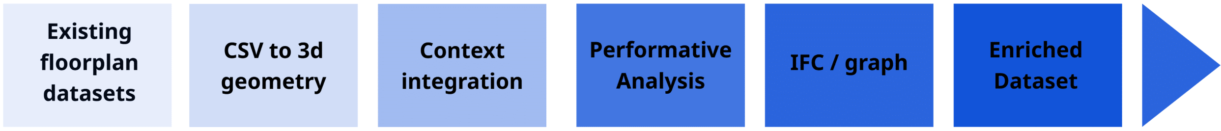 By connecting existing workflows from floorplan to performative analysis, we can create a semi automated pipeline that enhances floorplan datasets with performative data. Our proposed workflow includes acquiring a floorplan dataset, raster-to-vector conversion, generating a 3D model, integrating site context, and running performance analyses.