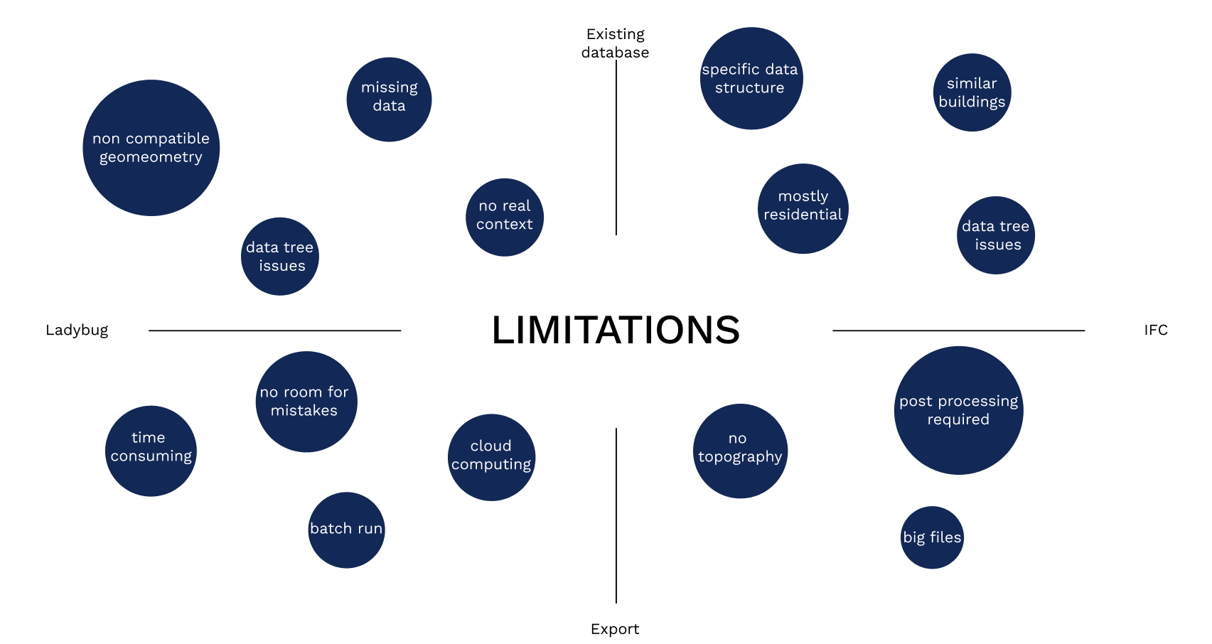 Along the way we hit the real pain points of the field: patchy or missing inputs, the absence of real-world context in source datasets, and the brittleness of Grasshopper data trees when scaling to complex hierarchies. Performance simulations are accurate but computationally heavy, making geometry QA (open loops, overlaps, orphaned elements) and caching indispensable. On the packaging side, IFC files grow quickly and become unwieldy without strict scoping, and the lack of topography further limits contextual fidelity.
